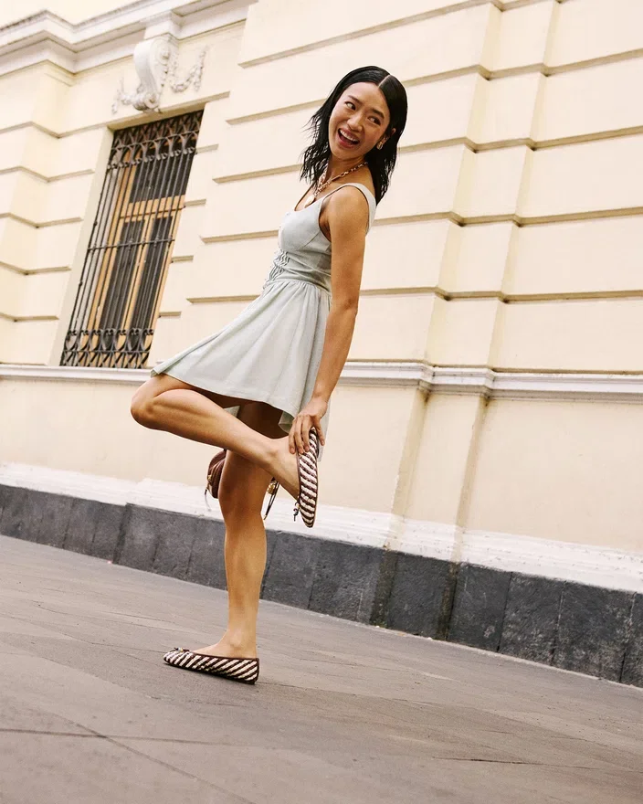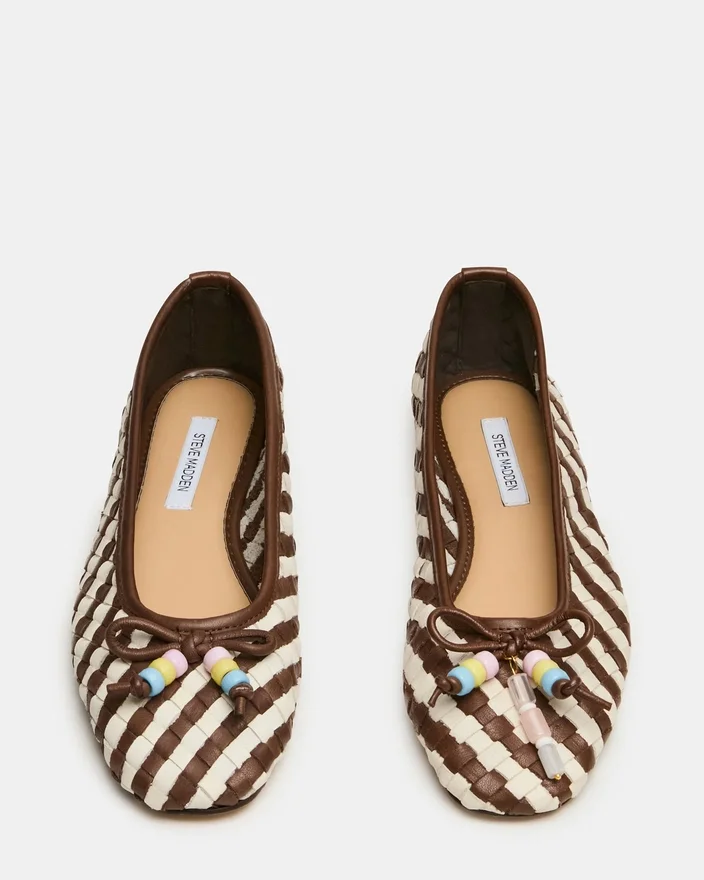 Divy-ballerinaskoene i hvitt/brunt skinn viser raffinert håndverk med sin vevde konstruksjon og elegante sløyfe. Dette designet med rund tå balanserer minimalistisk estetikk med funksjonell eleganse, noe som gjør dem til et ideelt valg for deg som ønsker en allsidig ballerinasko som passer til alle anledninger. De strukturerte, vevde detaljene gir et interessant utseende samtidig som de bevarer den diskrete raffinementet som ballettsko er kjent for.