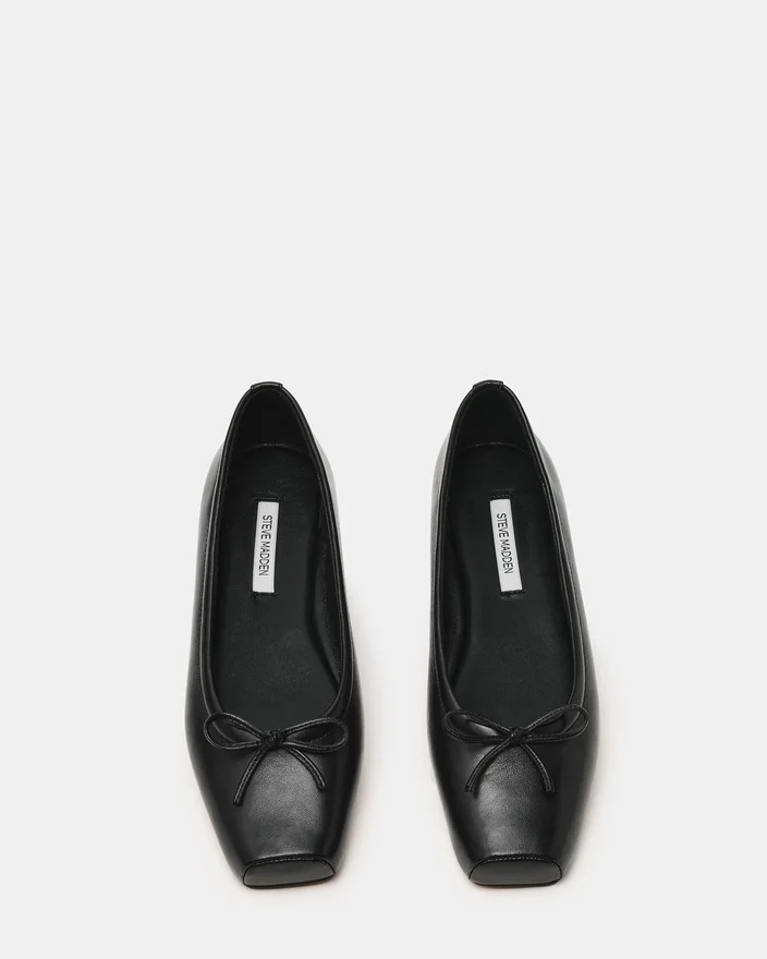 Eleve Black Leather Refined Ballet Flat løfter hverdagselegansen. Silhuetten med firkantet tå gir et moderne preg samtidig som den tidløse appellen til en klassisk ballerinasko bevares. Denne modellen er utstyrt med en delikat sløyfedetalj på vristen og balanserer raffinement med diskret sjarm. Perfekt for en sømløs overgang fra kontoret til kvelden, og denne allsidige ballerinaskoen gir komfort uten å gå på kompromiss med elegansen.