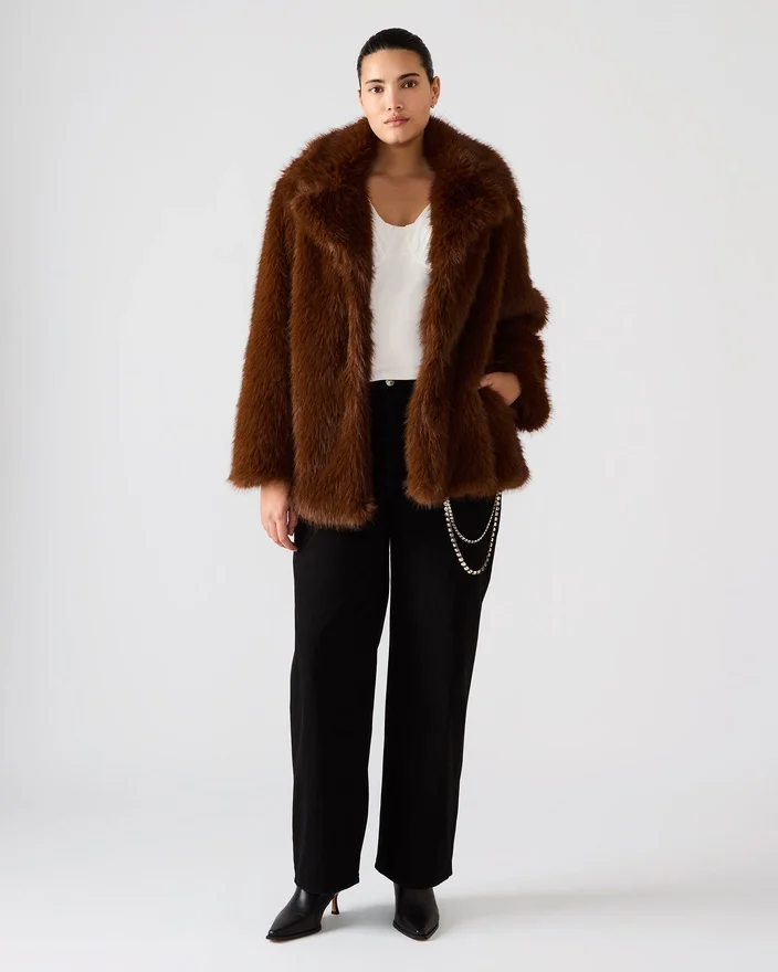 Kindra-kåpen er en luksuriøs jakke i imitert pels, designet for å gi varme og stil i de kalde årstidene. Den myke teksturen gir et sofistikert utseende samtidig som den sikrer komfort og isolasjon. Denne kåpen er perfekt for å løfte ethvert antrekk, og kombinerer dyktig håndverk med etiske materialer for et elegant, dyrevennlig yttertøyalternativ.