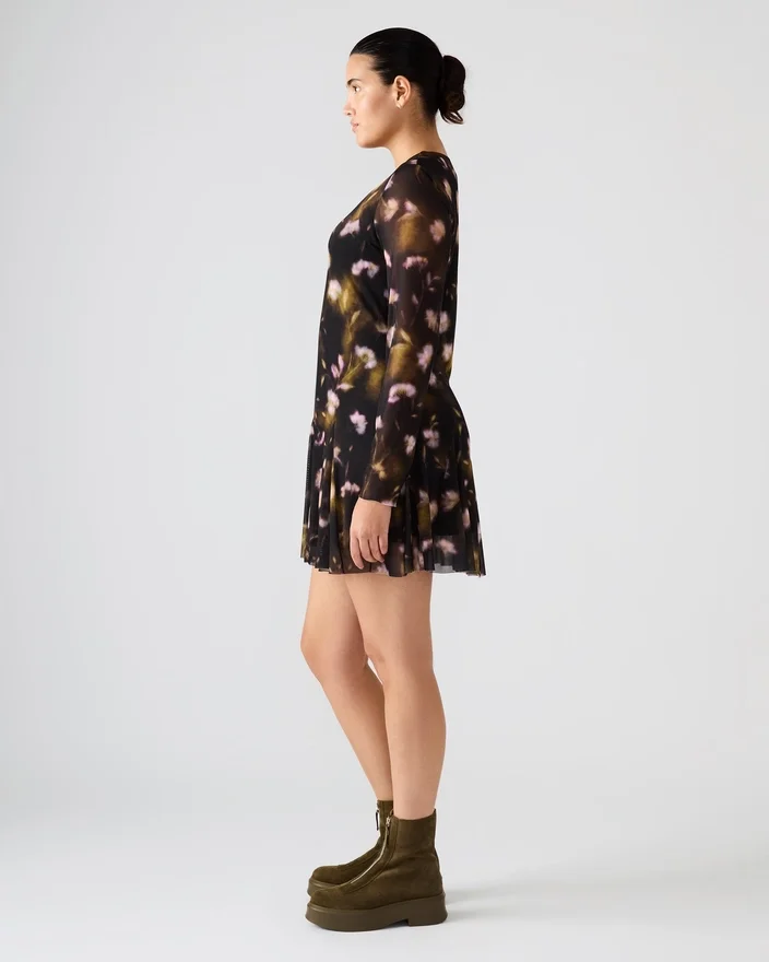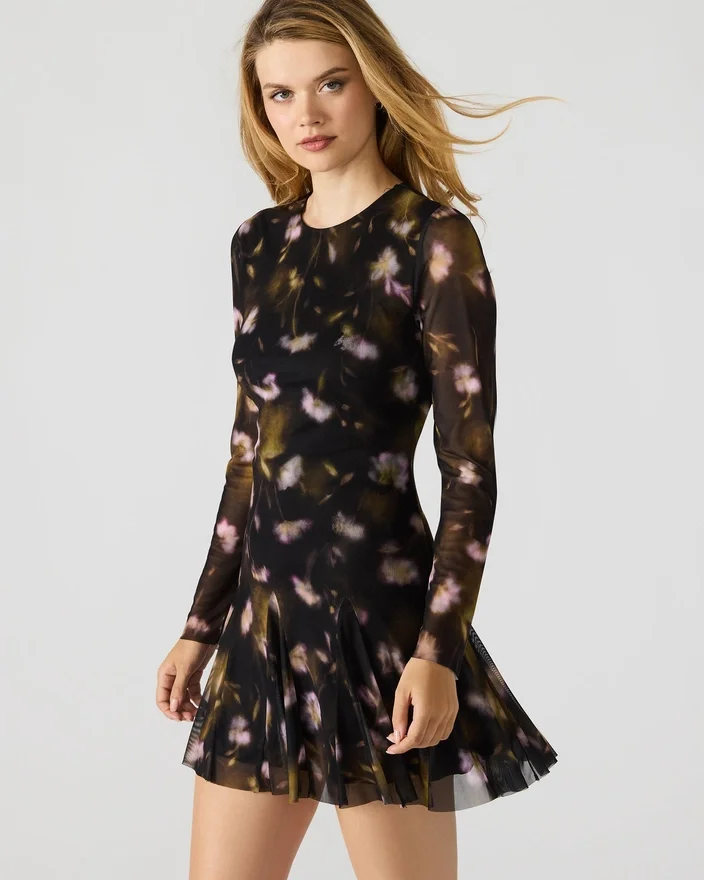 Oppgrader garderoben din med Bliss-kjolen i svart med små blomster, med en flatterende minilengde og en flytende silhuett som beveger seg uanstrengt. Denne kjolen har delikate, gjennomsiktige mesh-ermer for en subtil, moderne kant, mens det intrikate, svarte blomstermønsteret gir en tidløs, feminin sjarm.