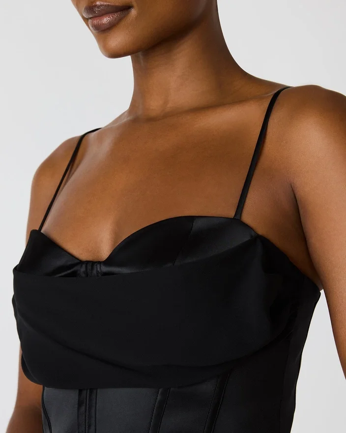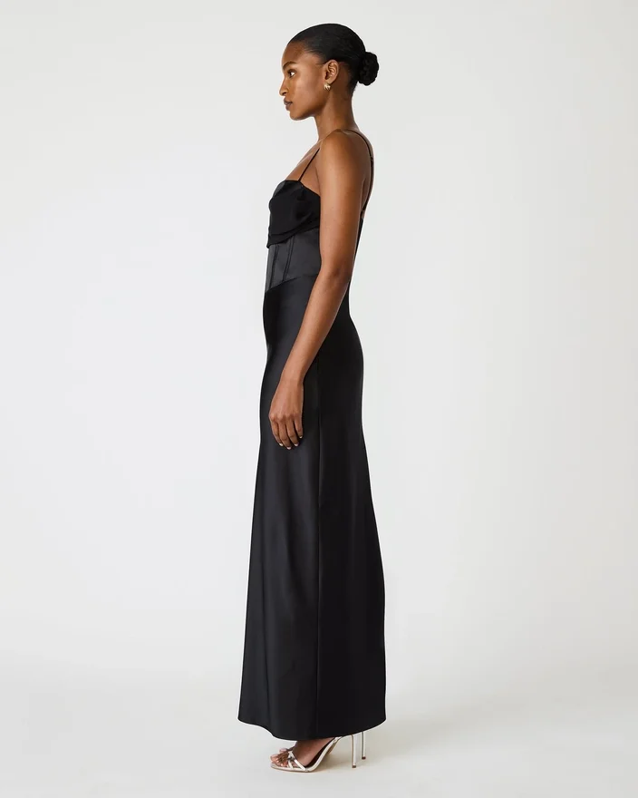 Carmela-kjolen i svart kombinerer tidløs eleganse med moderne raffinement. Denne maxikjolen er laget av luksuriøst satengstoff og har et strukturert bustier-liv som gir flatterende støtte og form. Justerbare stropper gir en tilpasset passform, mens den praktiske glidelåsen i ryggen sørger for enkel påkledning.