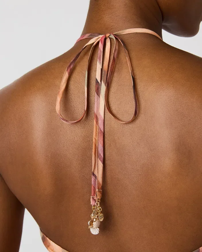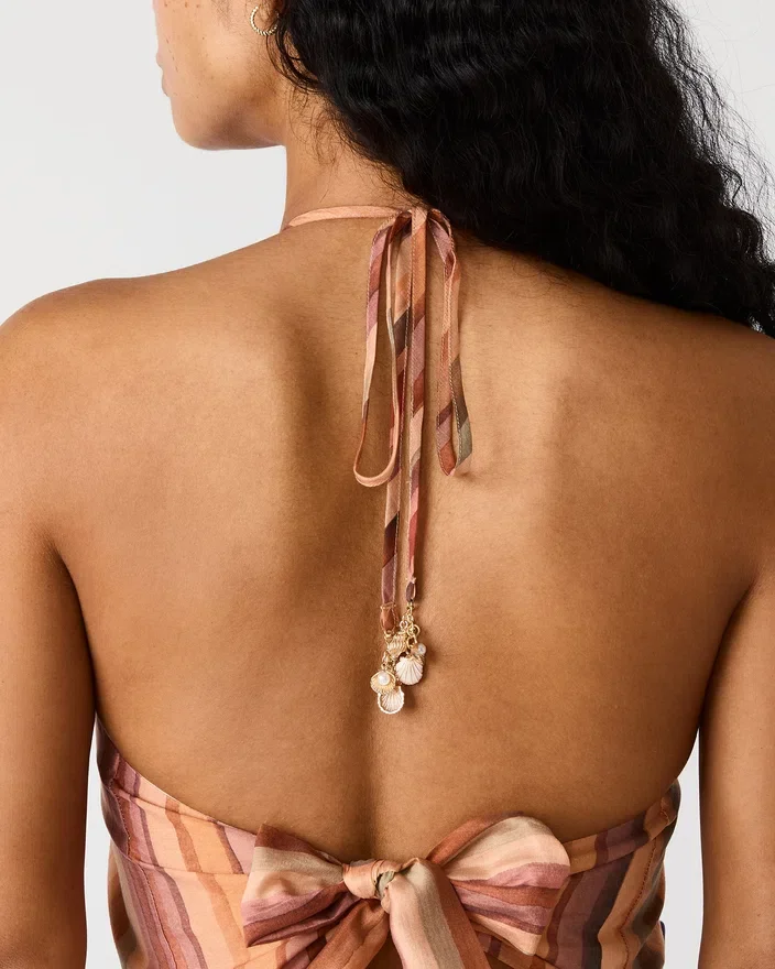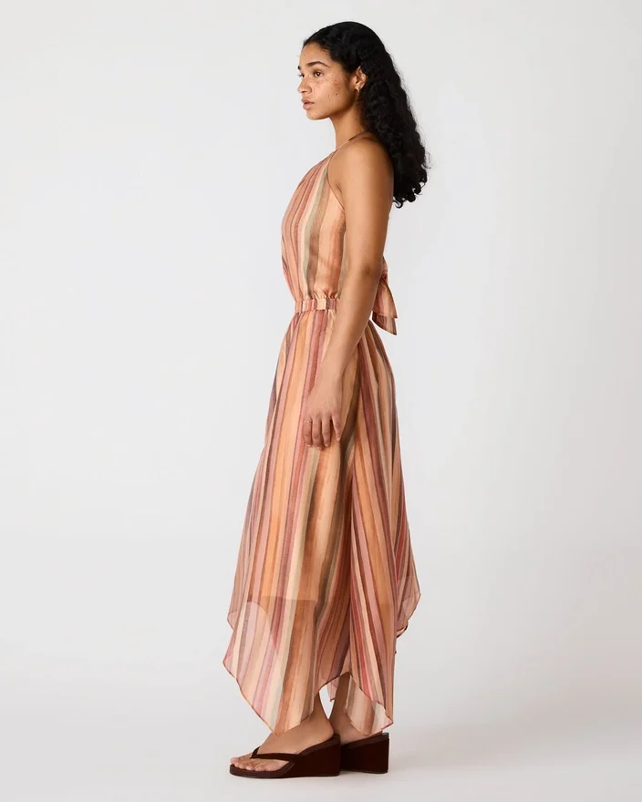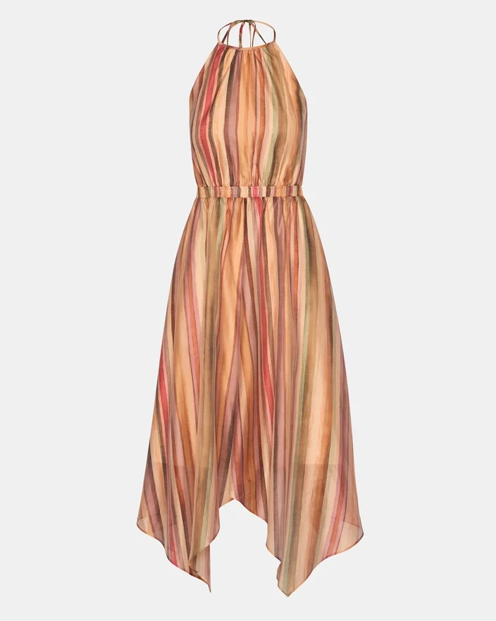 Dalina-kjolen Stripe Multi har en elegant halterneck som rammer inn skuldrene på en elegant måte, samtidig som den gir mange stylingmuligheter. Vertikale striper i en flerfarget palett gir silhuetten visuell interesse og bevegelse.