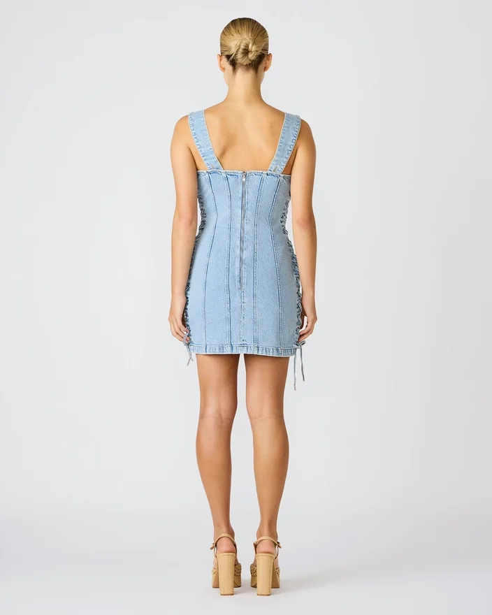 Oppgrader denimgarderoben din med denne elegante Gianka-kjolen i Hazey Blue, med en flatterende firkantet utringning og edgy snøring på siden. Den praktiske glidelåsen bak sørger for enkel påkledning, mens den klassiske denimkonstruksjonen gir tidløs allsidighet. Perfekt for fritidsaktiviteter eller festlige anledninger, og denne kjolen går sømløst fra dag til kveld.
