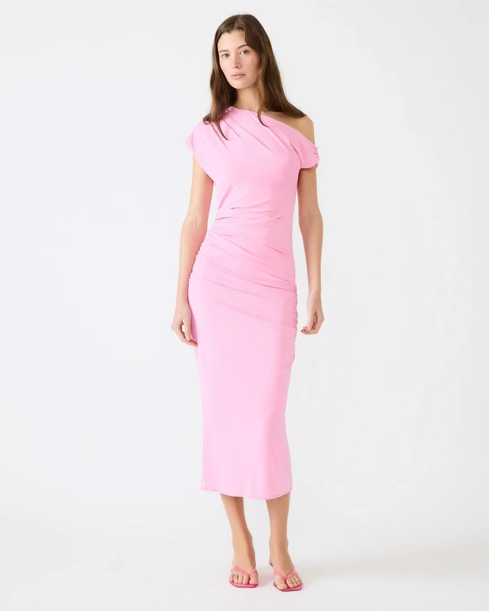 Gjør inntrykk i Gracelyn-kjolen Pink Taffy med en iøynefallende asymmetrisk utringning som gir et moderne og sofistikert uttrykk. Strategisk rynking på siden skaper en flatterende dimensjon og en elegant, polert silhuett. Perfekt for date-kvelder, cocktail-arrangementer eller når du vil vekke oppsikt.