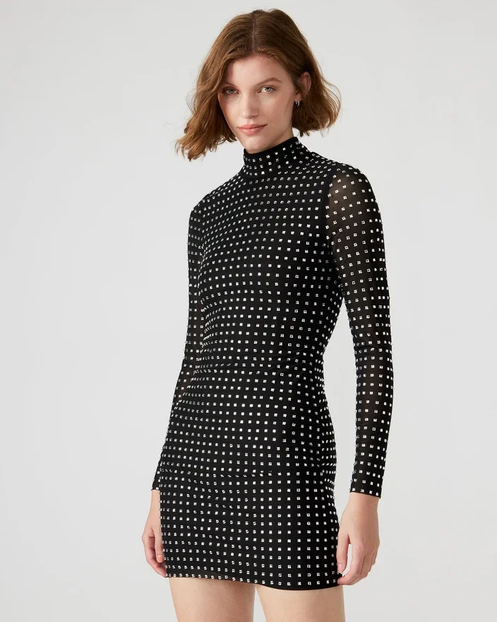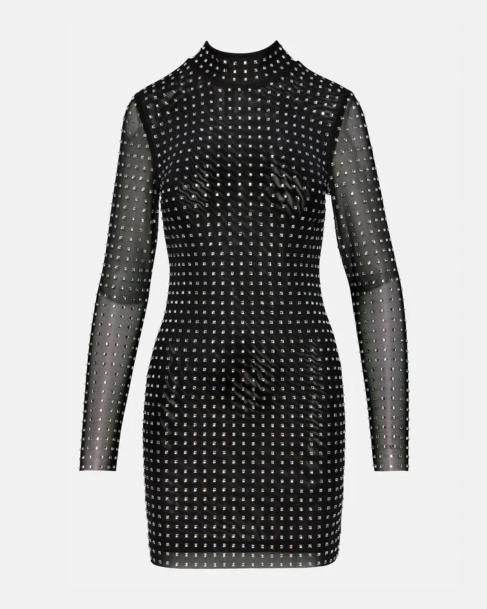Løft stilen din med vår Krista-kjole. Denne langermete minikjolen har en høyhalset krage og glidelås i ryggen. Denne nydelige kjolen har også unike firkantede strasspynt for et snev av glamour. Gjør inntrykk med dette elegante og sofistikerte plagget, perfekt for enhver anledning.