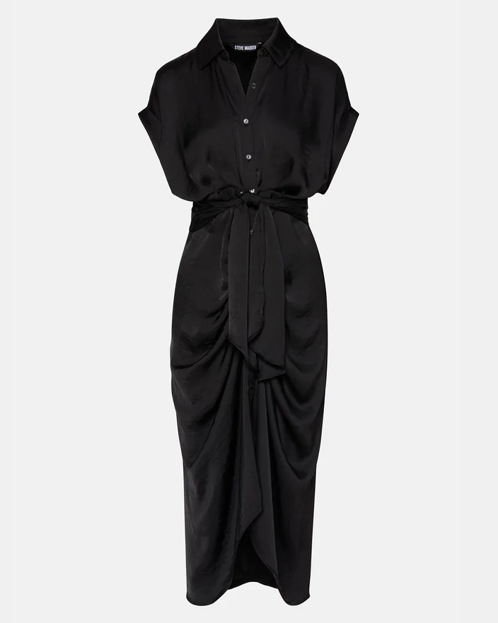 Tori-kjolen har en opprullet krage og korte ermer med mansjetter, med en justerbar, rynket snøring foran i livet og en asymmetrisk hem. Kjolen er ferdig med en vasket satengtekstur, noe som gir den et elegant utseende.