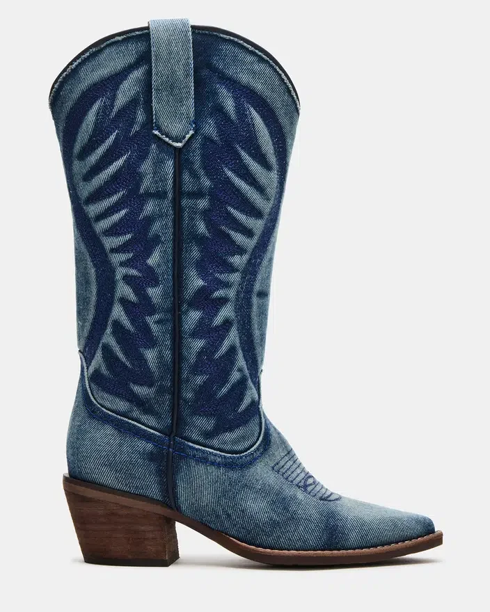 Disse Albany-støvletterne i denim med bredt skaft er fagmessig laget og har en spiss tå og tradisjonell Western-stil. Støvletterne er laget av kvalitetsmaterialer og er både stilige og holdbare.