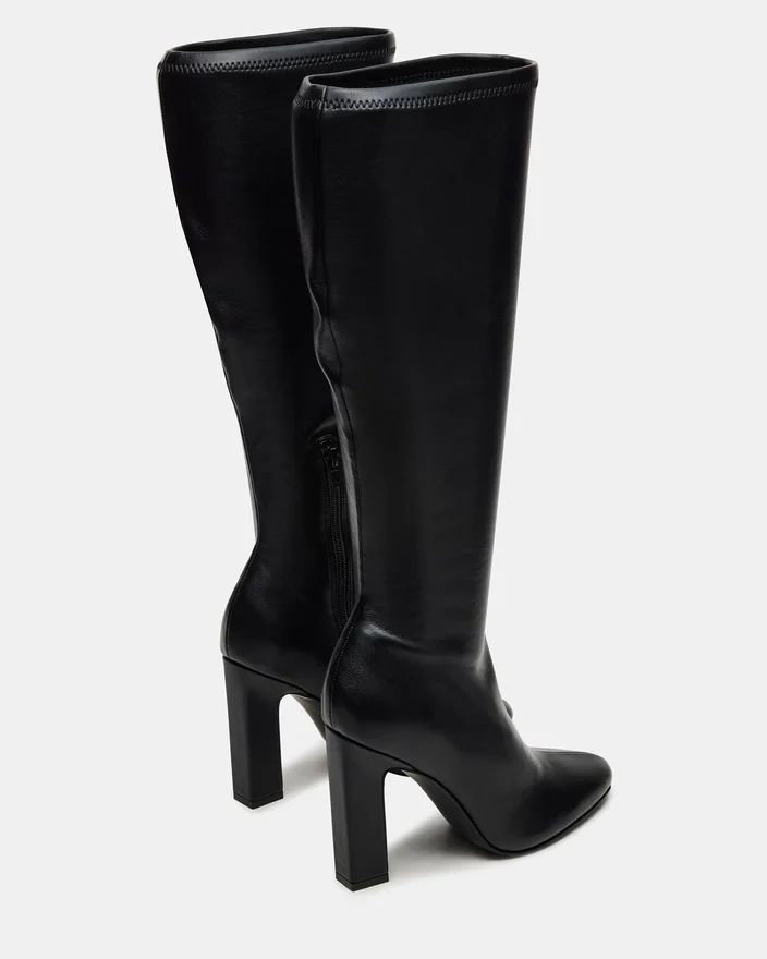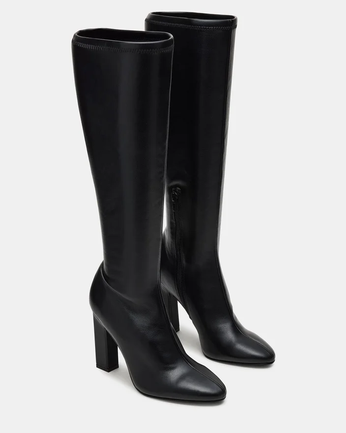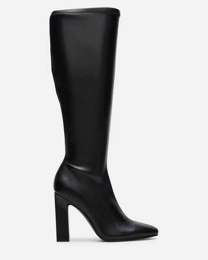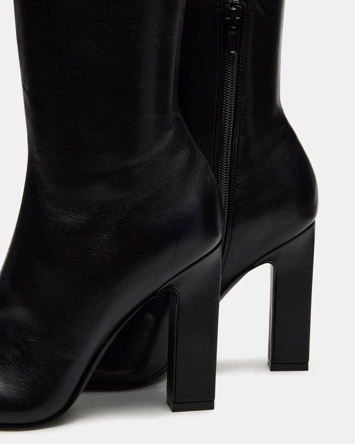 Løft stilen din med vår Aria Black Wide Calf knestøvle med høyhælte sko. Disse støvletterne er laget med et elegant design og vil gi et sofistikert preg til ethvert antrekk. Du kan trygt gå ut med stil takket være en behagelig hælhøyde og sikker passform. Perfekt for alle som er opptatt av mote.
