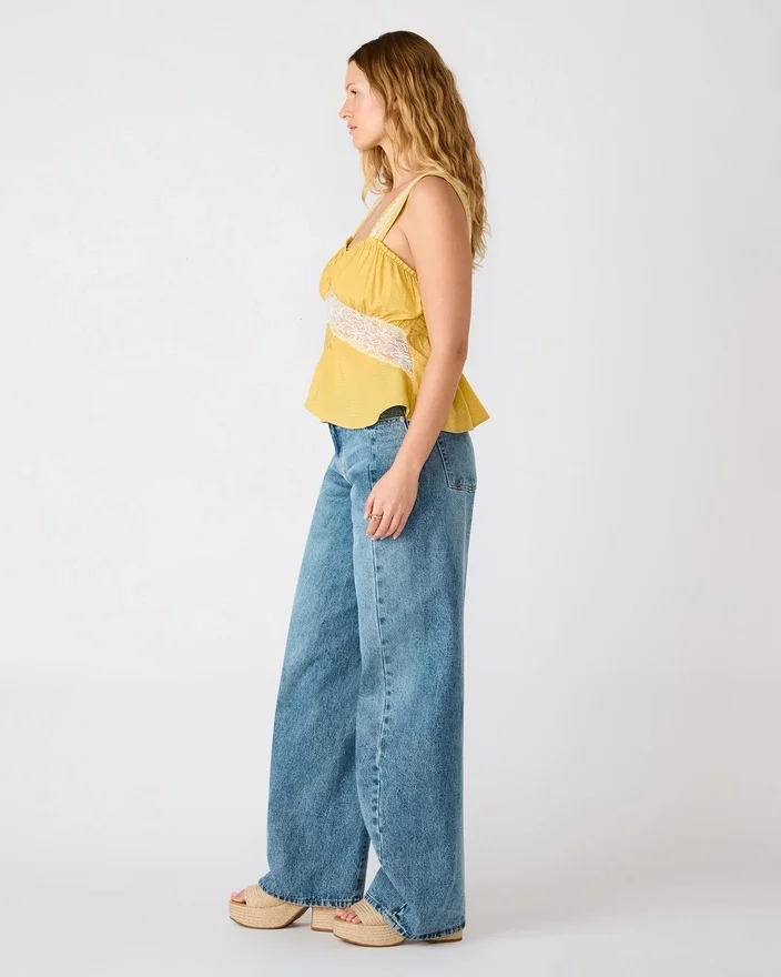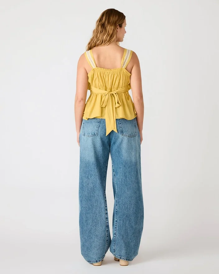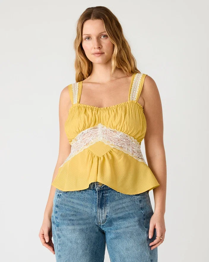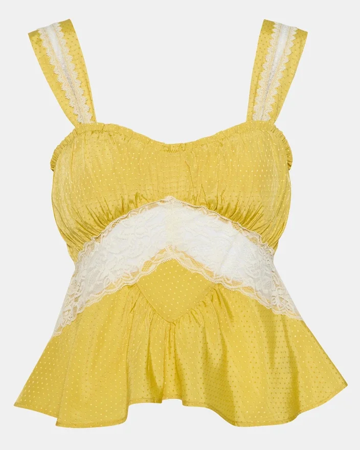 Cinthia-toppen i Golden Lime gir uanstrengt raffinement med sin ermeløse silhuett og matchende settdesign. Delikate blonder gir en raffinert tekstur, mens en elegant sløyfe pryder ryggen og gir en særegen finish.