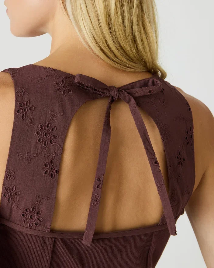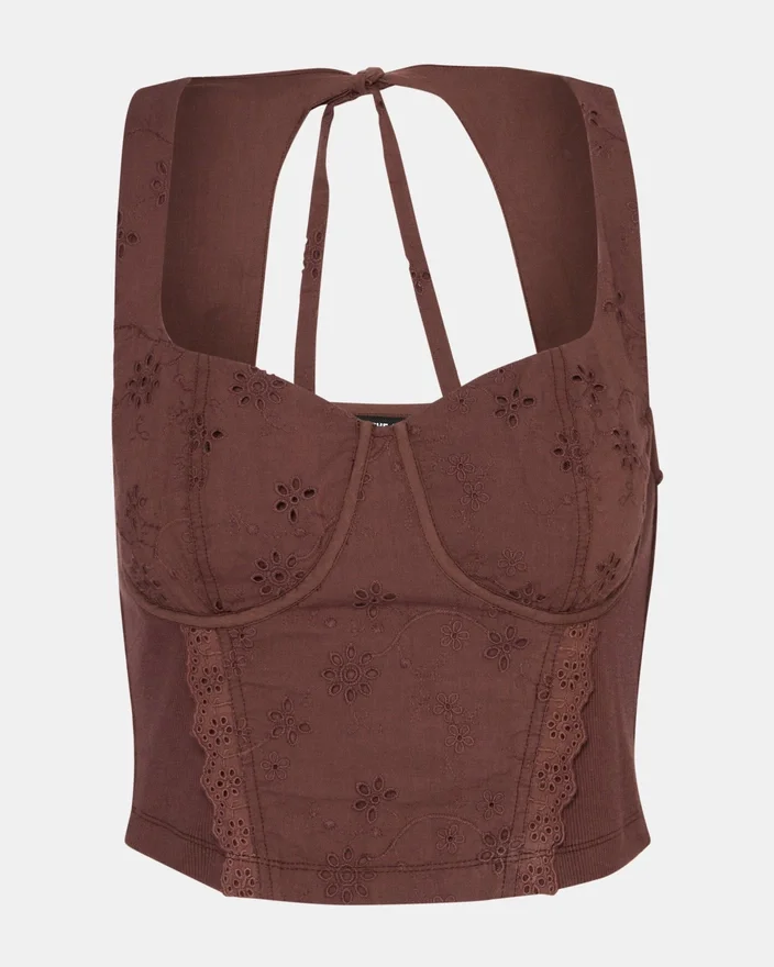 Dixie strikket topp i valnøttfarge gir uanstrengt eleganse med sin ermeløse silhuett og delikate hullmønster. En strategisk utskjæring på ryggen kombinert med en justerbar snøring skaper visuell interesse og gir mulighet for allsidig styling – kle den opp til kveldsanledninger eller ned til bruk i fritiden. Perfekt for lag-på-lag-stilen eller alene, dette plagget passer perfekt gjennom alle årstider.