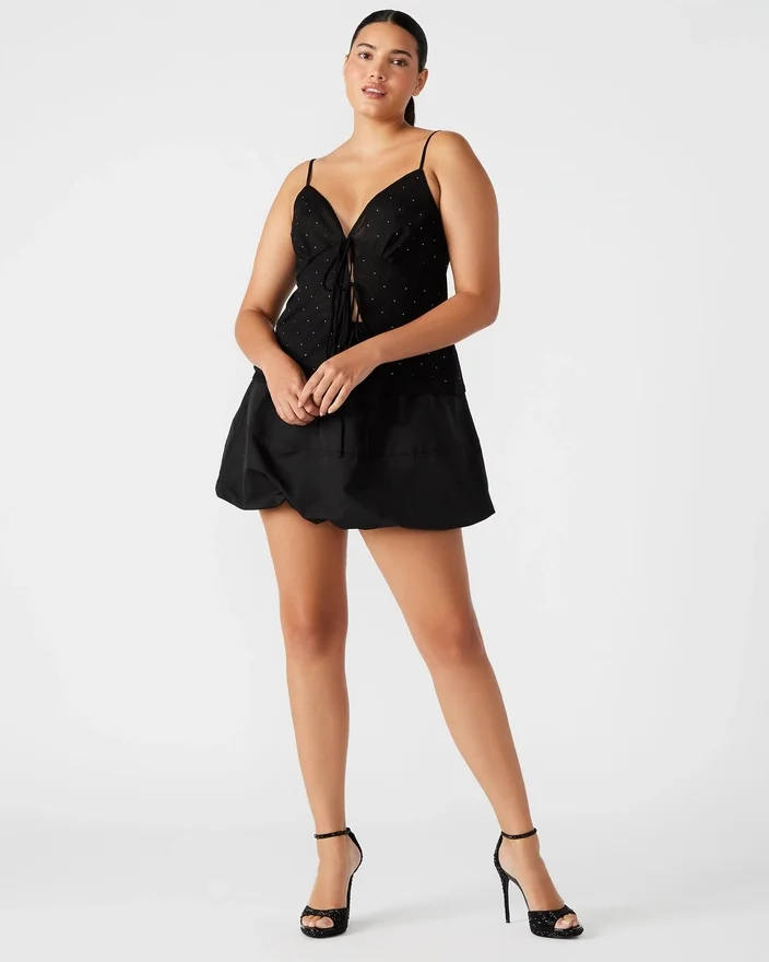 Vi presenterer Indy Top, en elegant camisole-tank med et stilig design med bånd foran og små, delikate rhinestone-nitter. De justerbare stroppene gir en perfekt passform, noe som gjør den til et must-have for enhver motebevisst garderobe.