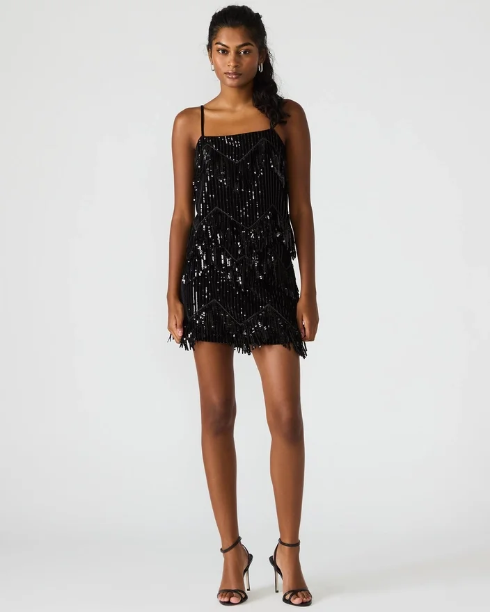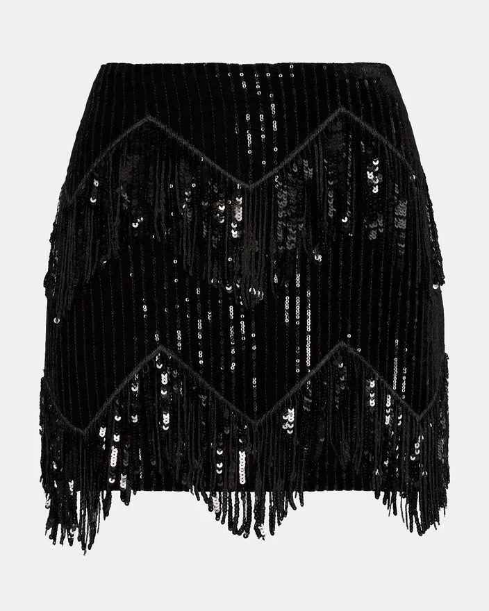 Løft kveldsstilen din med Cindi paljettskjørt i svart. Dette skjørtet har glitrende paljettdekorasjoner arrangert med dynamiske frynser, som gir bevegelse og et dristig uttrykk til looken din. Designet som en del av et matchende sett, tilbyr det et koordinert, moteriktig antrekk som er perfekt for spesielle anledninger eller kvelder ute. Skjørtets luksuriøse finish og flytende frynser skaper et iøynefallende uttrykk samtidig som det er lett å ha på seg.