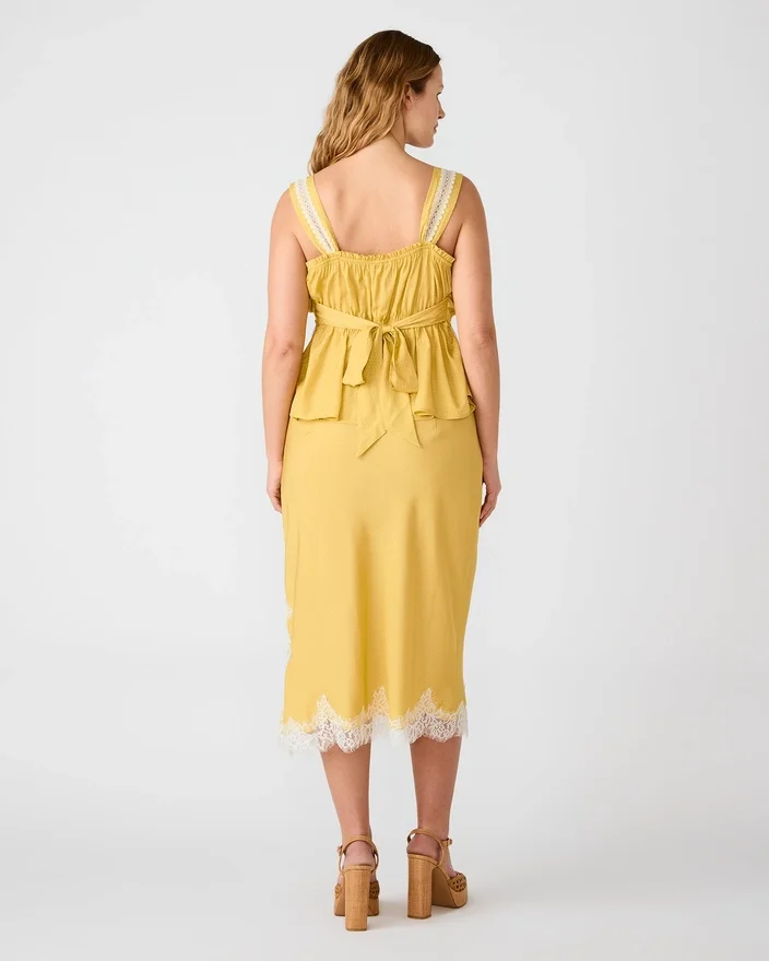 Cinthia-skjørtet i Golden Lime gir en uanstrengt raffinement med sin midilengde og delikate blonder. Dette allsidige plagget passer like godt på dagtid som på kvelden, og gir en raffinert stil som løfter enhver garderobe.