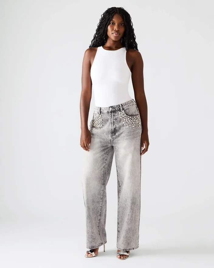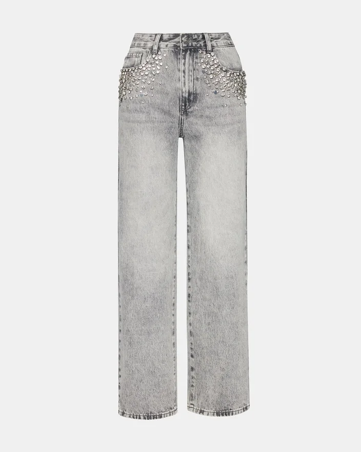 Eras-jeansen har en elegant, rett benform som fremheves av delikate strassdetaljer som gir en diskret glans. -design