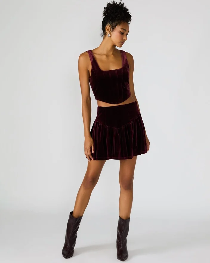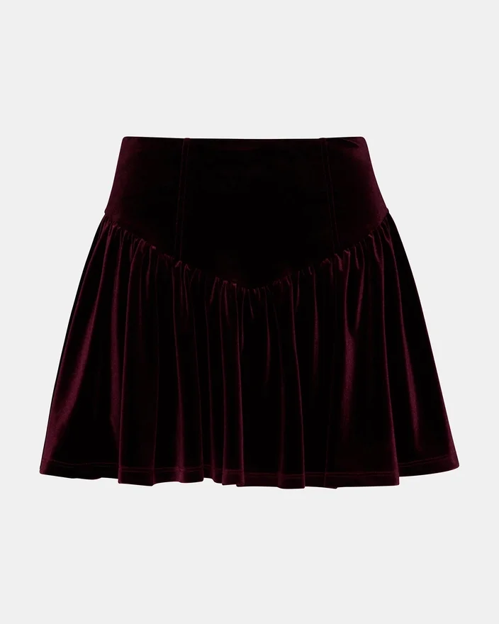Oppgrader garderoben din med Jayla-skjørtet i vinrød, et flytende miniskjørt i fløyel designet for uanstrengt eleganse. Dette plagget passer perfekt sammen med det matchende settet og gir et helhetlig og luksuriøst utseende som er perfekt for spesielle anledninger eller stilig hverdagsbruk.