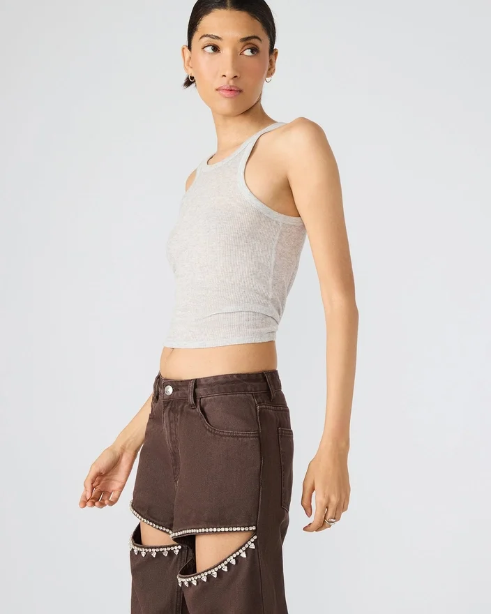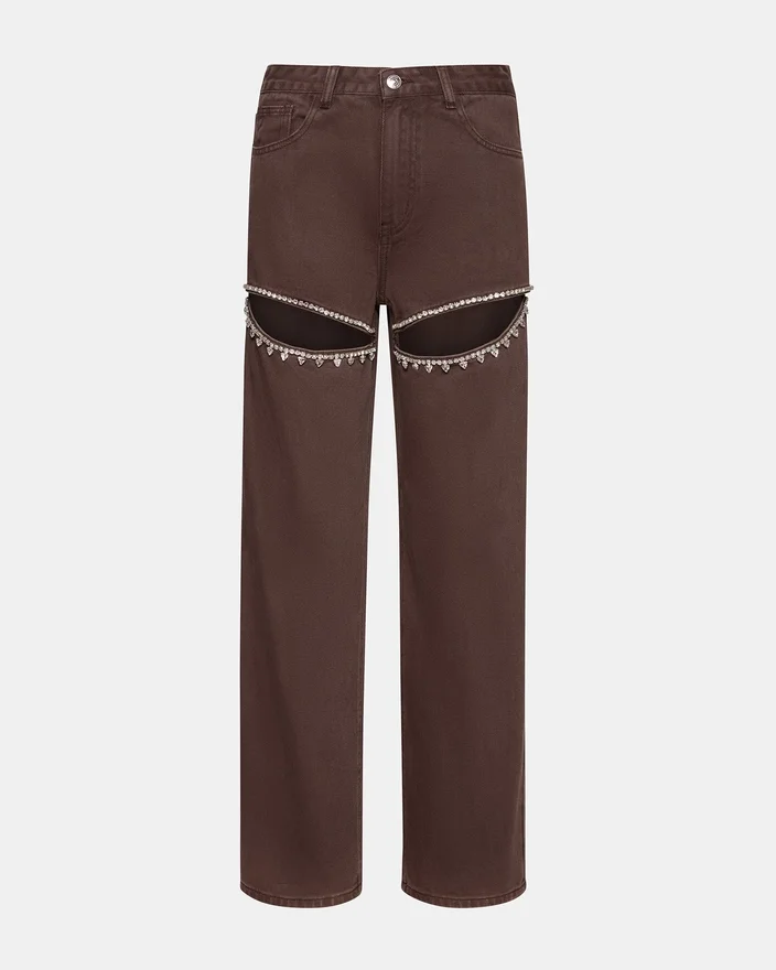 Taylor-jeansene gir en stilig vri på et klassisk design. Med sin vide passform tilbyr disse jeansene komfort og allsidighet, mens de intrikate utskjæringene med rhinestones på lårene gir et snev av glamour.