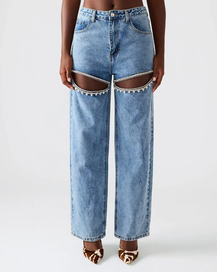 Taylor-jeansene gir en stilig vri på et klassisk design. Med sin vide passform tilbyr disse jeansene komfort og allsidighet, mens de intrikate utskjæringene med rhinestones på lårene gir et snev av glamour.