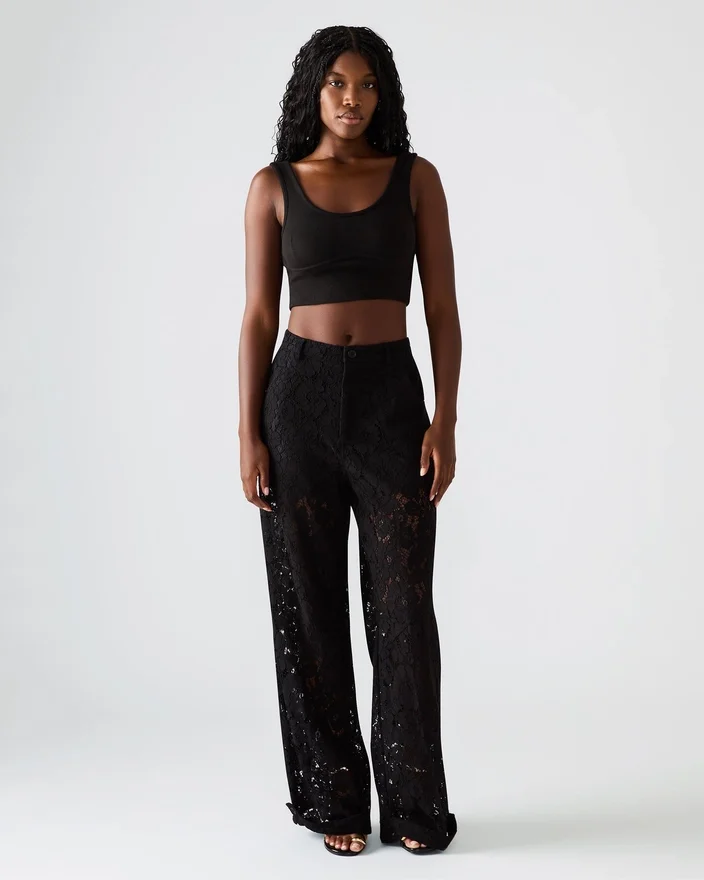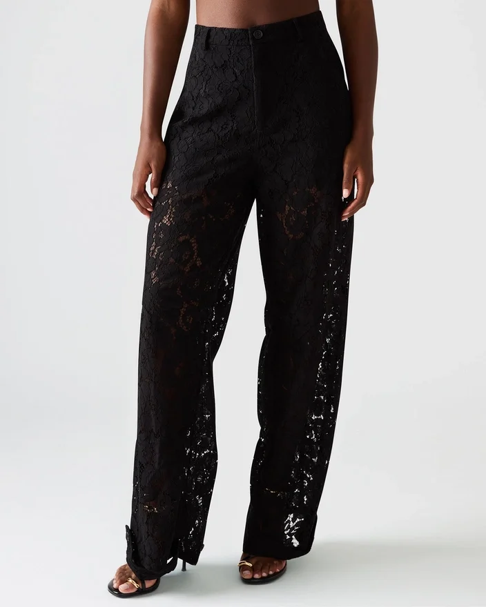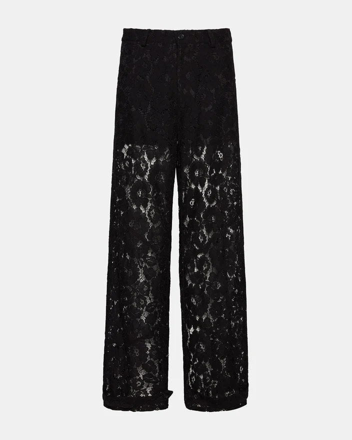 Tre Lace Pant gir et sofistikert preg med sin gjennomsiktige blonder- og nettingkonstruksjon, perfekt for lag-på-lag-stilen eller for å gjøre et dristig inntrykk. Disse buksene er designet for å passe perfekt sammen som et matchende sett, og kombinerer delikat tekstur med moderne stil, noe som gir både komfort og en slående silhuett som passer til elegant fritidsklær eller kveldsklær.