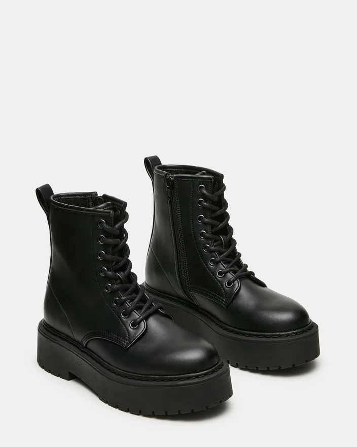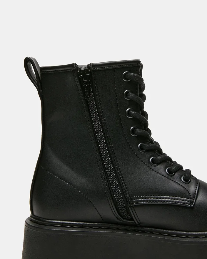 Buffy Black Combat Ankelstøvletter leverer stil med et raffinert preg. Denne ankelhøye snørestøvlen har en strukturert silhuett som tiltrekker seg oppmerksomhet, enten den styles med edgy antrekk eller denim.