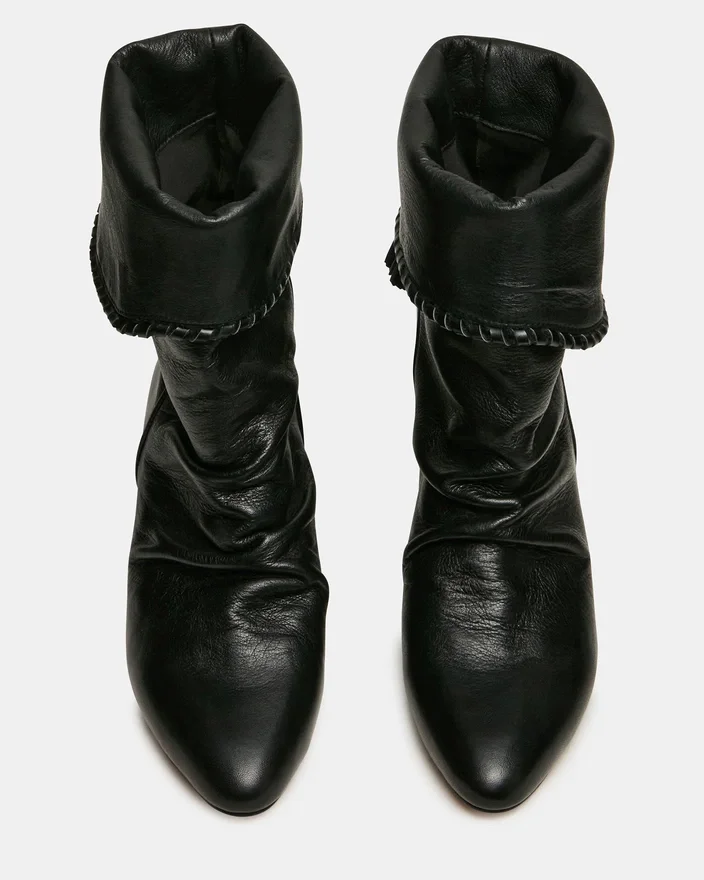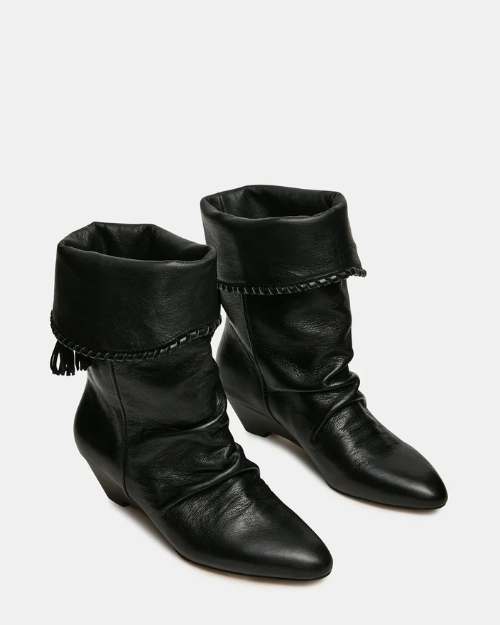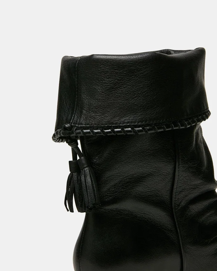 Enaya svart skinn-kilehæl-ankelstøvlet kombinerer arkitektonisk raffinement med forfinede detaljer. En spiss tå forlenger benet, mens det rynkede designet gir tekstur og visuelt interesse. Tassel-detaljen gir en elegant finish som løfter ethvert antrekk.