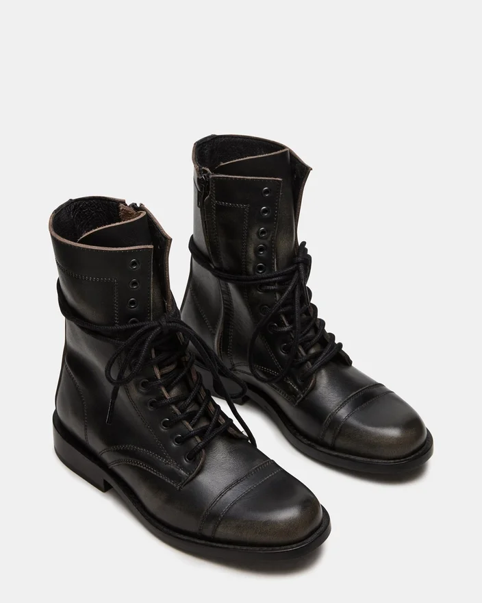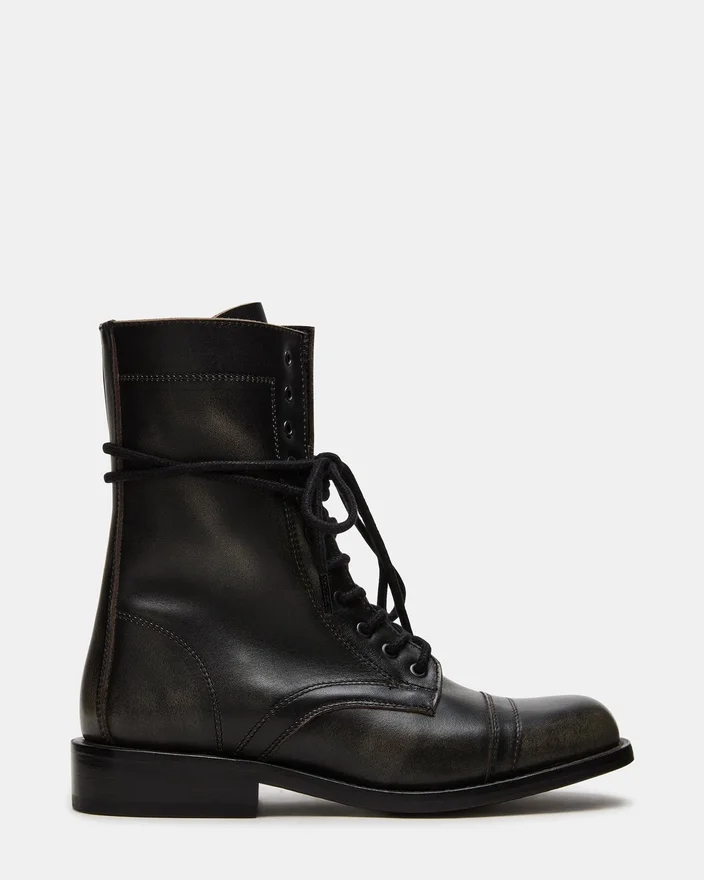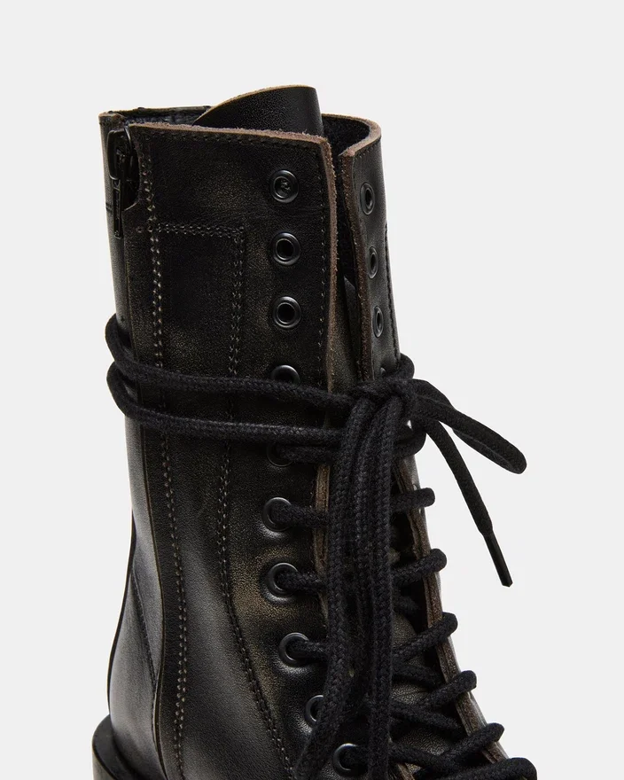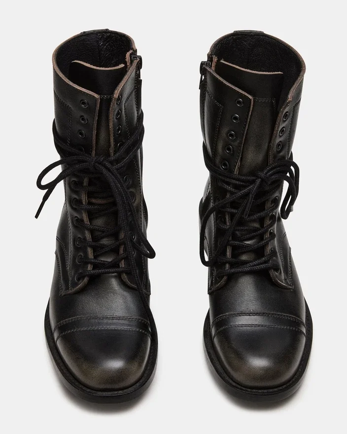 Theron Black Distressed snørestøvlet i motostil kombinerer robust stil med slitesterk konstruksjon. Denne ankelstøvletten er designet for pålitelig bruk og har en distressed finish som gir et ekstra preg til ethvert antrekk. Den sikre snøringsdesignen sikrer en tilpasset passform, mens den solide sålen gir grep og støtte som passer for hverdagslige eventyr.