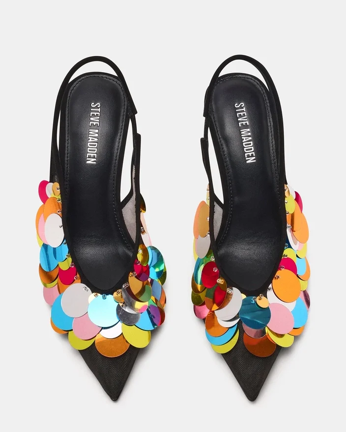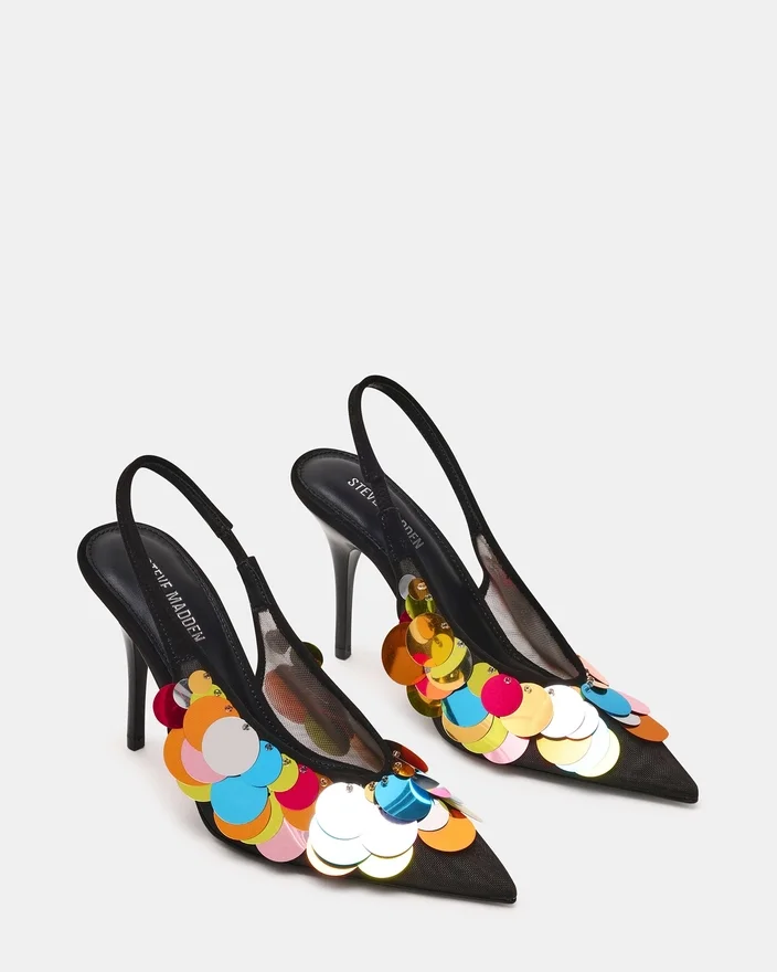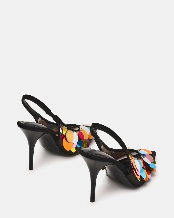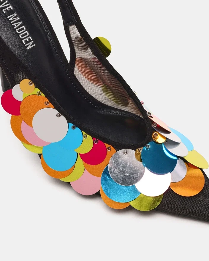Avid Black Mesh-pumpsen kombinerer livlige, flerfargede paljetter med pustende mesh, noe som skaper en slående visuell kontrast. Den spisse tåen gir en elegant silhuett, mens stroppen bak sikrer en sikker og komfortabel passform. Denne hælen kombinerer stil og raffinement på en perfekt måte og løfter ethvert antrekk med en særegen finish.