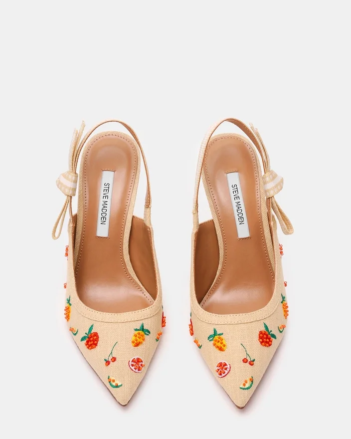 Et grosgrain-bånd er viklet rundt slingback-stroppen på Bri Raffia Fruit Multi spiss tå stilettpumpe og avsluttes med en sløyfe som fremhever siden av skoen.