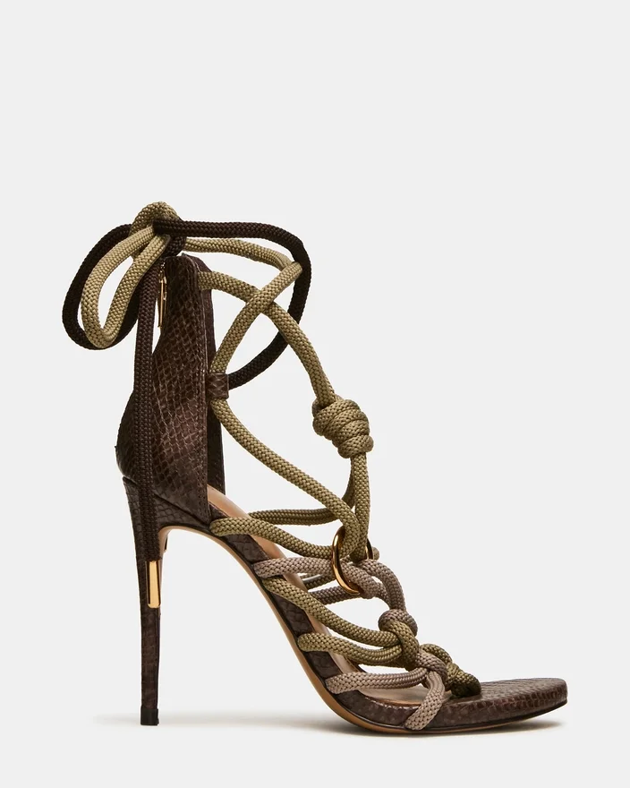Catnyss Olive har en iøynefallende stilett-hæl som fremheves av intrikate tau- og knutedetaljer som vikler sig rundt leggen. Dette arkitektoniske designet forvandler en klassisk silhuett til et statement-plagg, og kombinerer raffinert håndverk med dristig visuell interesse. Konstruksjonen med bånd rundt leggen gir en tilpassbar passform samtidig som den tilfører et kantete uttrykk. Perfekt for deg som setter pris på sko som kombinerer eleganse med særegne designelementer.