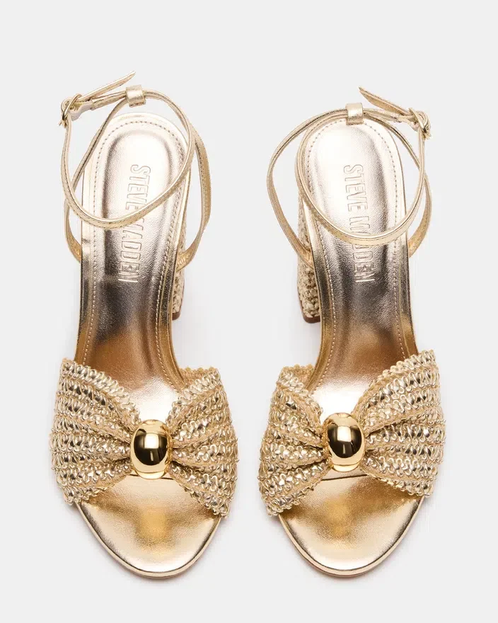 Cheyla Gold-sandalen har en stilig raffia-hæl kombinert med en solid blokk-hæl for komfort hele dagen. Med en sikker ankelrem tilbyr denne sandalen både mote og funksjon. Oppgrader sommergarderoben din med denne allsidige og elegante skoen.