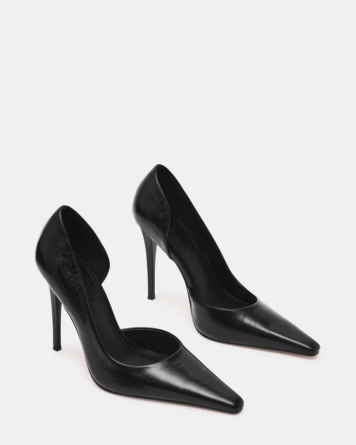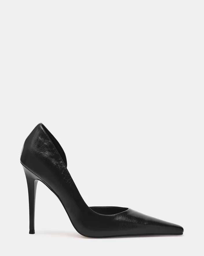 Løft stilen din med disse elegante pumpsene i svart skinn, med spiss tå og en slank stilett-høyhælte sko som gir sofistikert høyde. Rynkene fremhever silhuetten og skaper et raffinert utseende som er perfekt for formelle anledninger eller profesjonelle omgivelser. Denne skoen er designet for både sjarm og selvtillit, og tilfører garderoben din dyktig håndverk og tidløs design.