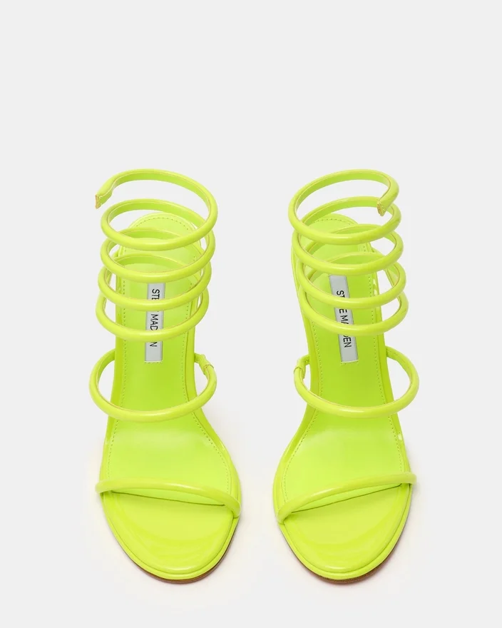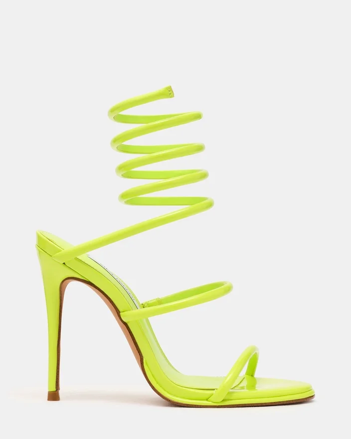 Gi garderoben din et snev av luksus med Exotica Lime Patent. Denne stilett-sandalen med stropper som vikler seg rundt leggen gir et unikt utseende og en følelse som skiller seg ut i enhver folkemengde.