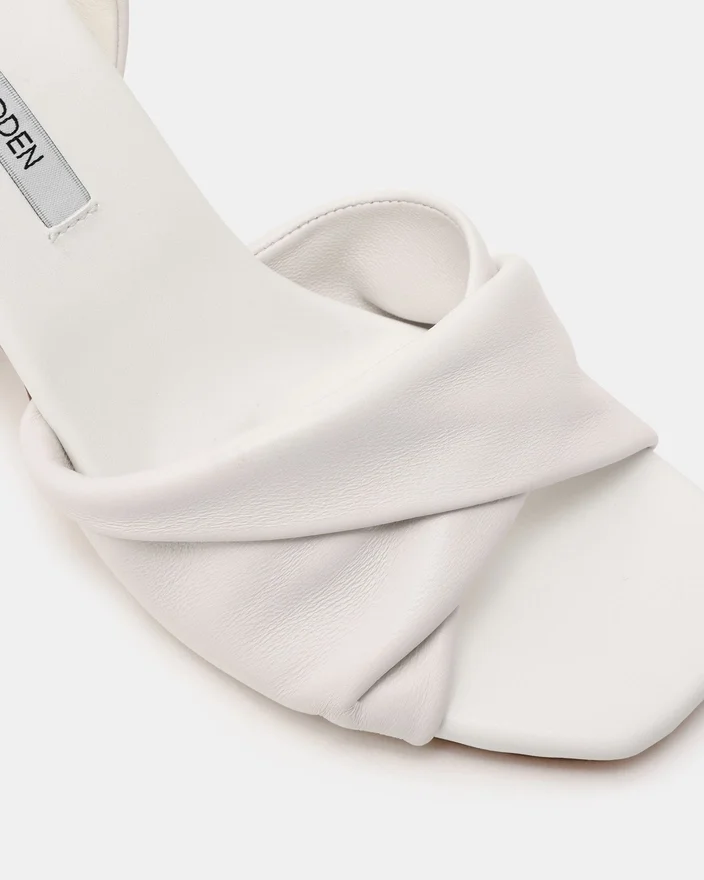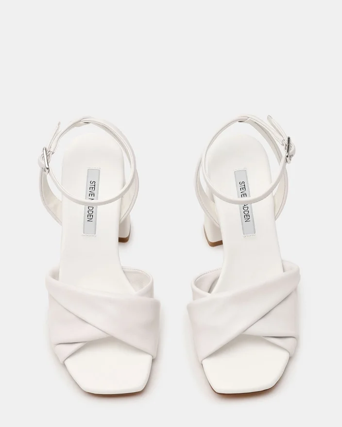 Mandy i hvitt skinn gir en raffinert vri på hverdagsstilen. Med en støttende blokkhæl og en skarp, firkantet tå byr denne hælen på både stabilitet og et moderne uttrykk. En justerbar ankelrem sikrer en sikker og komfortabel passform, mens de kryssende remmene gir dybde og et flatterende utseende. Enkel å style og behagelig å ha på, er dette et elegant valg for antrekk fra dag til kveld.