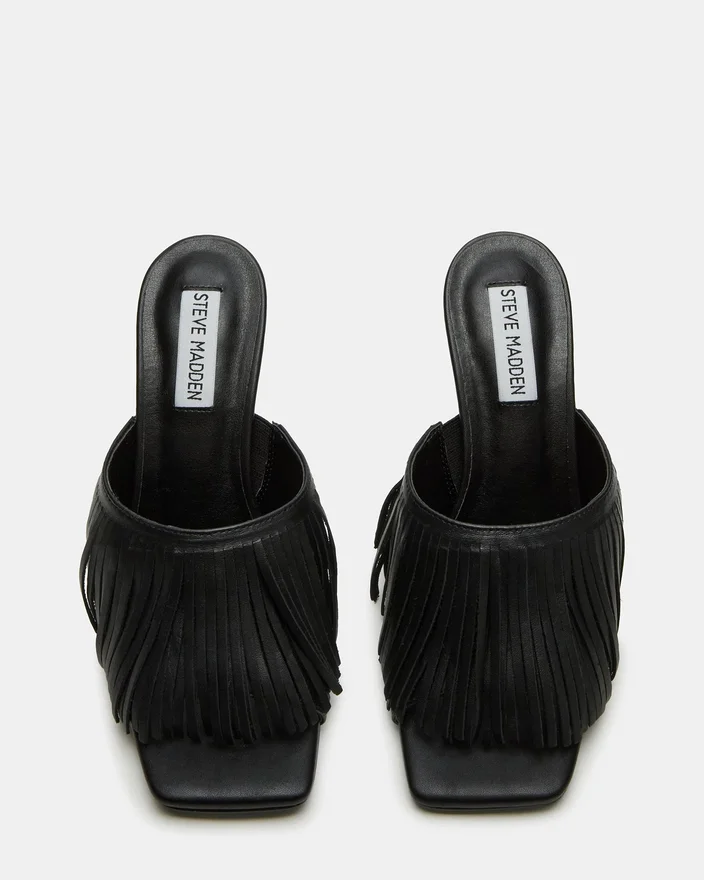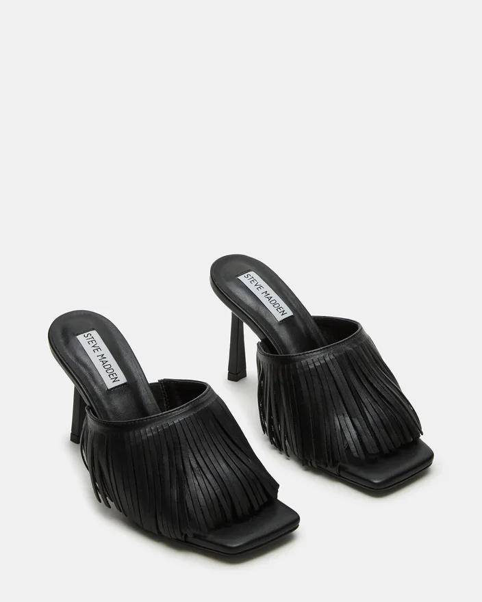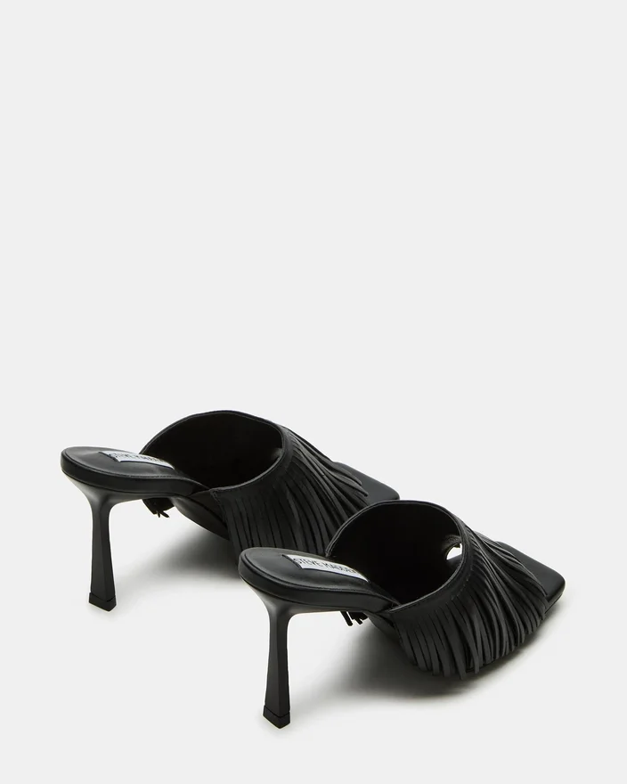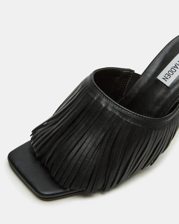 Morina Mule Heel er fagmessig laget med en elegant firkantet tå og stilett-hæl, og gir et sofistikert preg til ethvert antrekk. Den åpne tåen og frynsedesignet gir en unik stil, noe som gjør den til et allsidig og elegant tilskudd til garderoben din.
