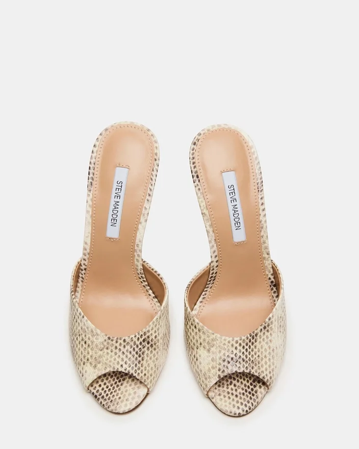 Priya Natural Snake-sandalen kombinerer en slank stilettohæl med et retroinspirert peep-toe-design på remmen foran.