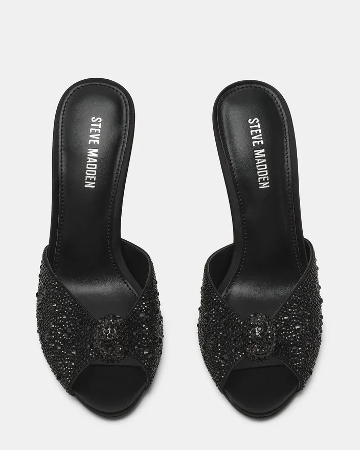 Priya Black Rhinestones-sandalen kombinerer en slank stilettohøyhæl med en gjennomsiktig mesh-peep-toe-rem prydet med mini-rhinestones som glitrer og glitrer ved hvert skritt.