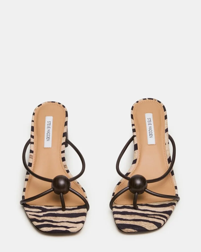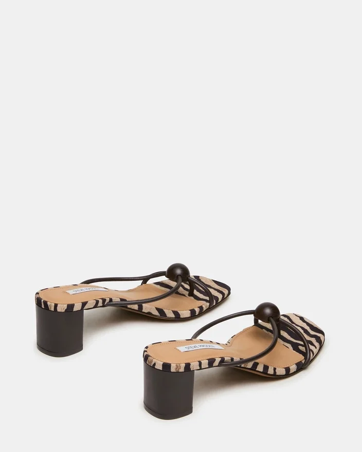 Opplev uanstrengt stil med Raquelle Brown Multi Thong Heel, designet for komfort hele dagen. Den solide blokk hælen gir stabil støtte, mens den firkantede tåen gir et moderne preg. Den delikate perlepynten tilfører et snev av raffinement til designet med remmer. Perfekt for å gå fra dag til kveld med diskret eleganse.