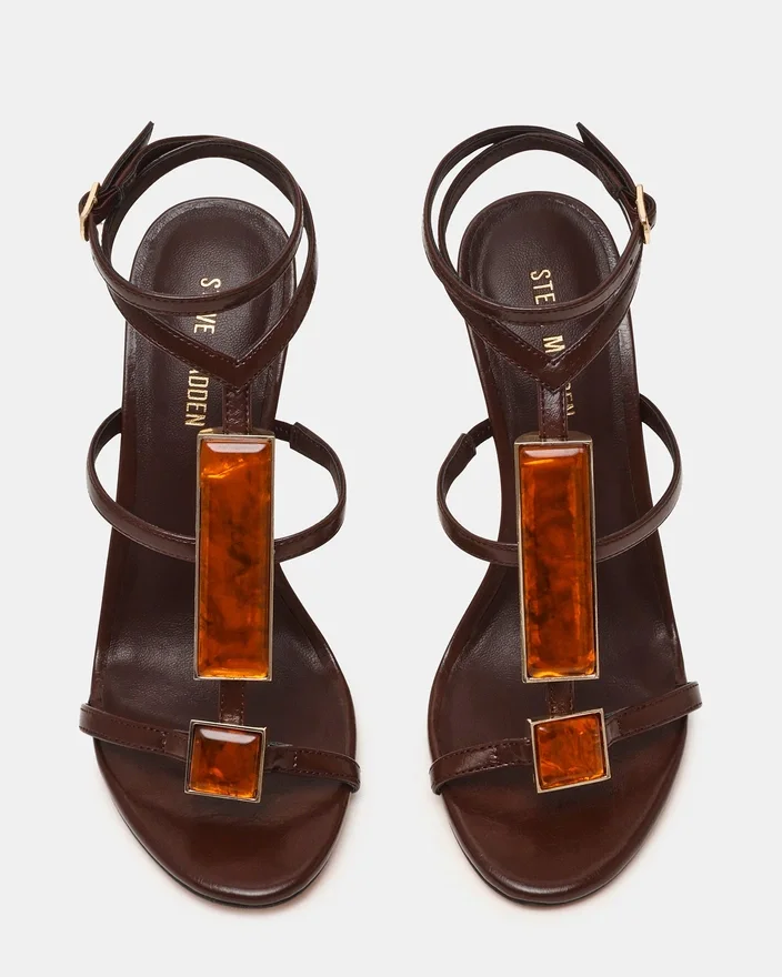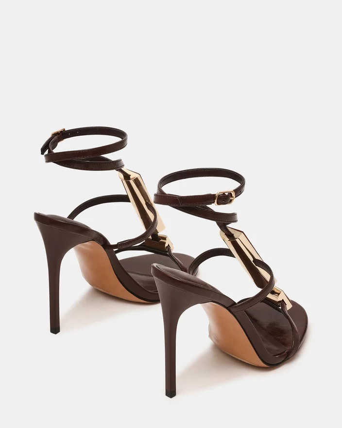 Shaylee Brown byr på tidløs raffinement med sin slanke stilett-hæl og raffinerte steindesign. Delikate stropper omslutter foten, mens en ankelstropp gir sikker støtte og elegant definisjon. Dette allsidige designet passer like godt til kveldsarrangementer som til eksklusive anledninger, og gir en elegant silhuett.