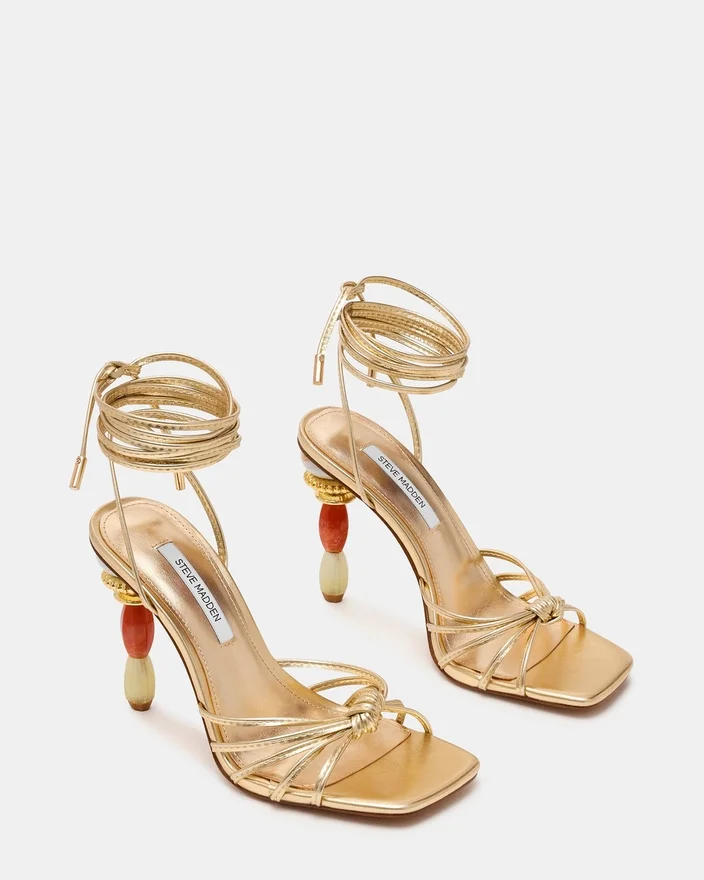 Solena Gold er en høyhælte sko med remmer som har en skulpturert silhuett og en arkitektonisk firkantet tå. Designet med bånd rundt leggen skaper en elegant, justerbar passform som fremhever ankelen samtidig som den gir fleksibilitet til å tilpasse stilen. Den raffinerte hælkonstruksjonen gir sikker støtte og et elegant utseende som passer til festlige anledninger og moderne garderober.