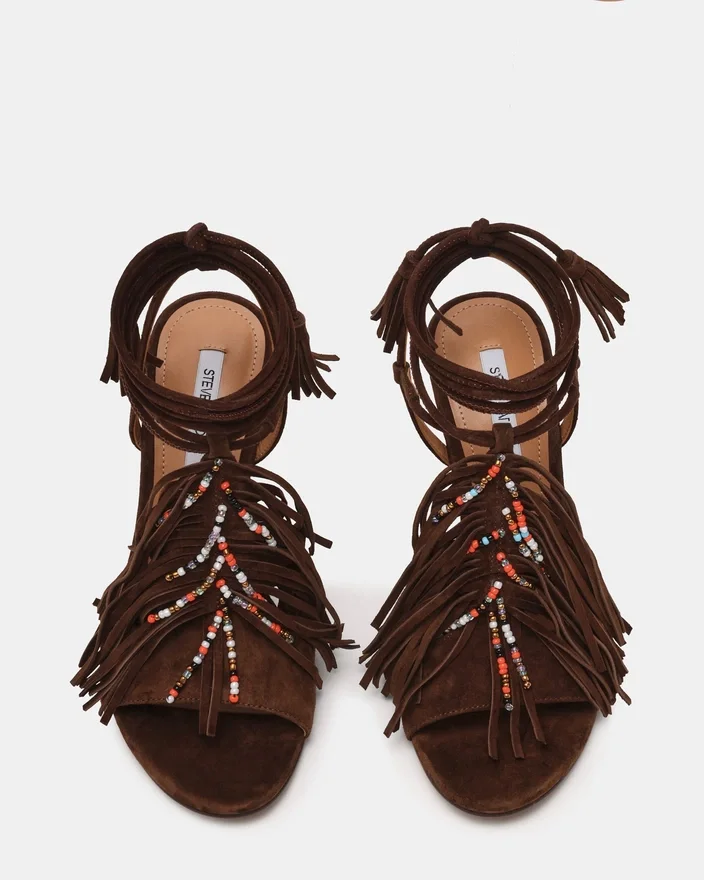 Talia Brown Suede stilettkilehæl kombinerer arkitektonisk design med luksuriøse dekorasjoner. Kaskader av frynser gir en dynamisk tekstur, komplementert av intrikate perledetaljer som fanger lyset ved hvert skritt. Den raffinerte stilett hælen gir både høyde og eleganse, noe som gjør dette til et essensielt valg for de som setter pris på sofistikert håndverk innen fottøy. Perfekt for anledninger som krever en stil som skiller seg ut og raffinert utførelse.