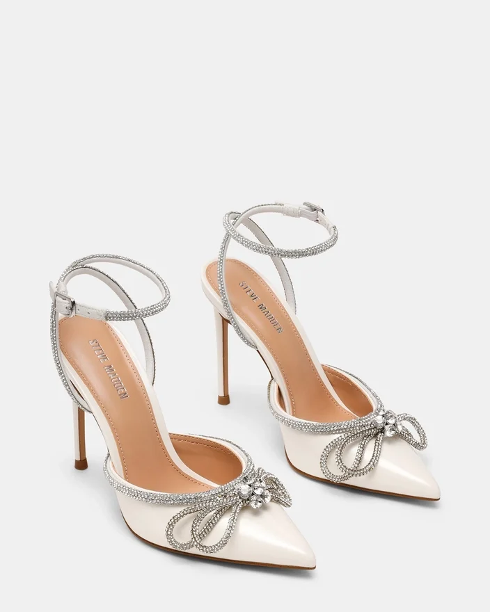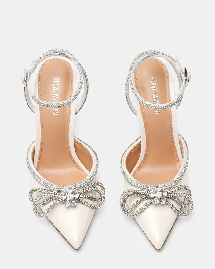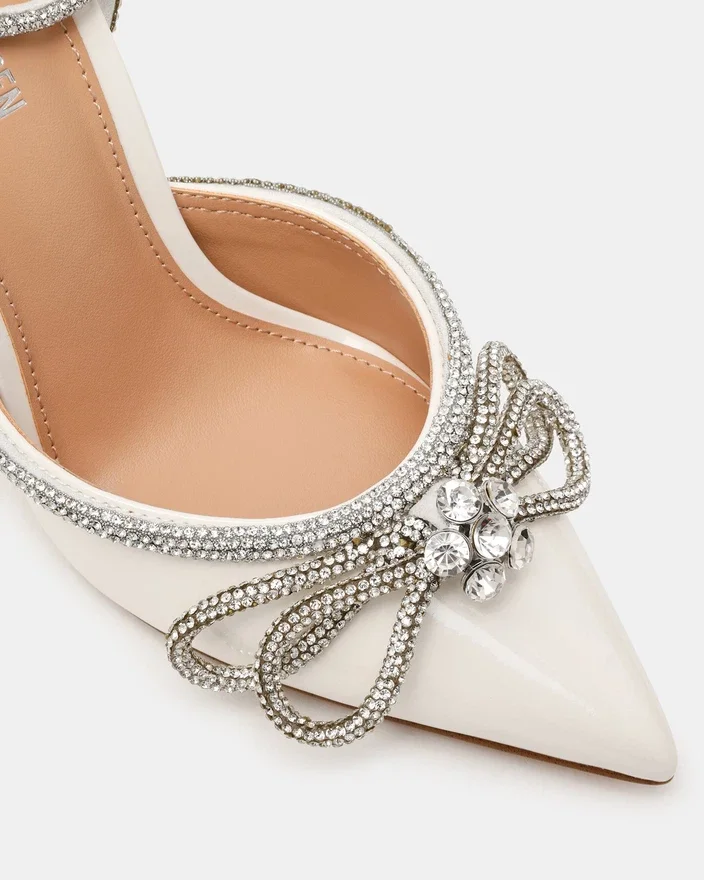 Du blir festens midtpunkt i Viable, høyhælte skoene du vil bruke i mange år fremover. Dette paret med spiss tå har en slank stilett-hæl, en smal ankelrem med rhinestones og et sløyfedesign.