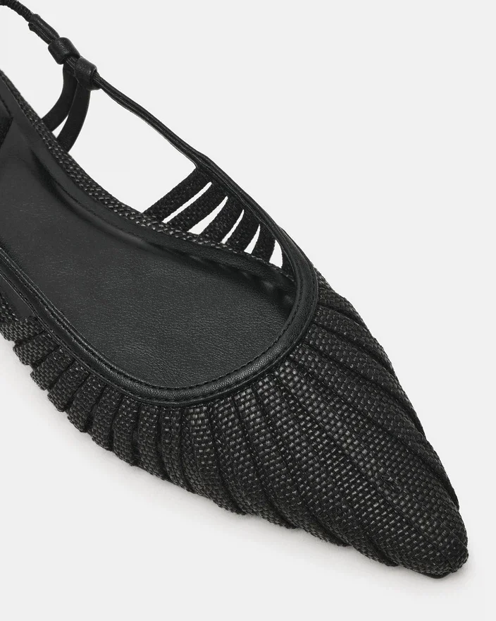 Alandria Black Raffia er en sofistikert flat sko med spiss tå som kombinerer tidløs eleganse med moderne komfort. Den vevde konstruksjonen gir en pustende struktur, mens Slingbacks-designet gir sikker støtte. Perfekt for overgangen fra kontoret til kvelden, og denne allsidige stilen passer uanstrengt til kjoler, bukser eller fritidsklær. Et raffinert must-have for den kresne garderoben.