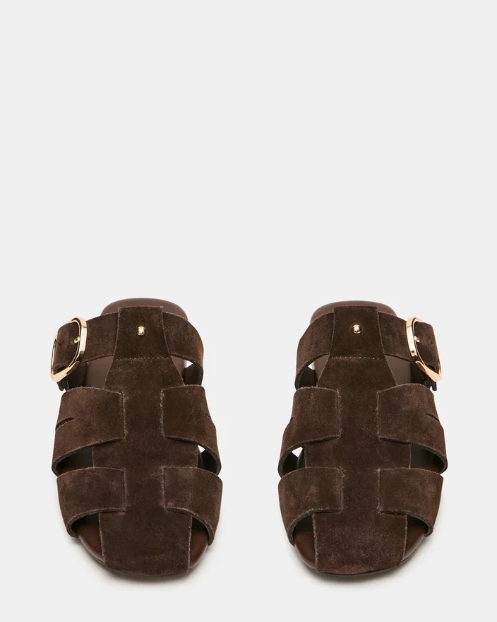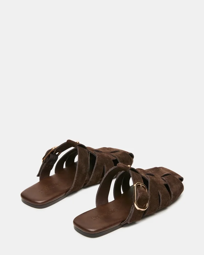 Halo Brown Suede har en karakteristisk fiskerstil med et burdesign som gir visuell interesse og støtte. Den justerbare spennestroppen gir en tilpasset passform, mens den flate sålen holder deg komfortabel hele dagen. Denne mule-silhuetten tilbyr enkel på-og-av-komfort uten å ofre stilen, noe som gjør den til et allsidig tilskudd til enhver garderobe.