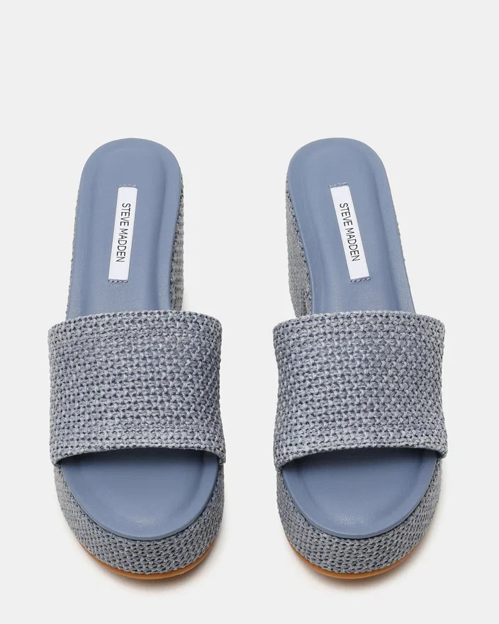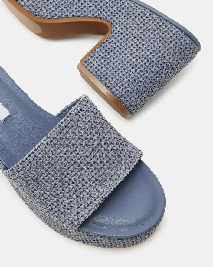 Trippy Blue-platåsandaler kombinerer stilig design med komfort. Med raffia-overdel og en solid hæl gir den pålitelig støtte samtidig som den fremhever silhuetten din. Mule-designet gjør den enkel å ta på, noe som gjør den til et ideelt valg for anledninger i varmt vær der både komfort og eleganse er viktig.