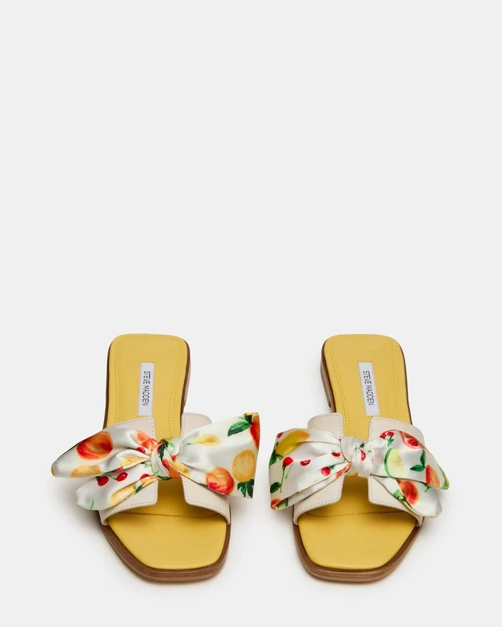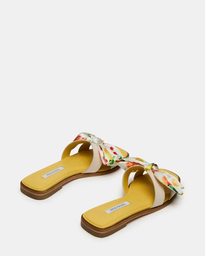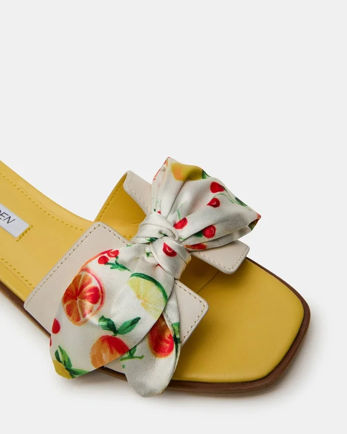 Geometriske utskjæringer på den brede, enkle stroppen på Hadyn Citrus Multi Scarf Slide gir denne flate sandalen et friskt preg.