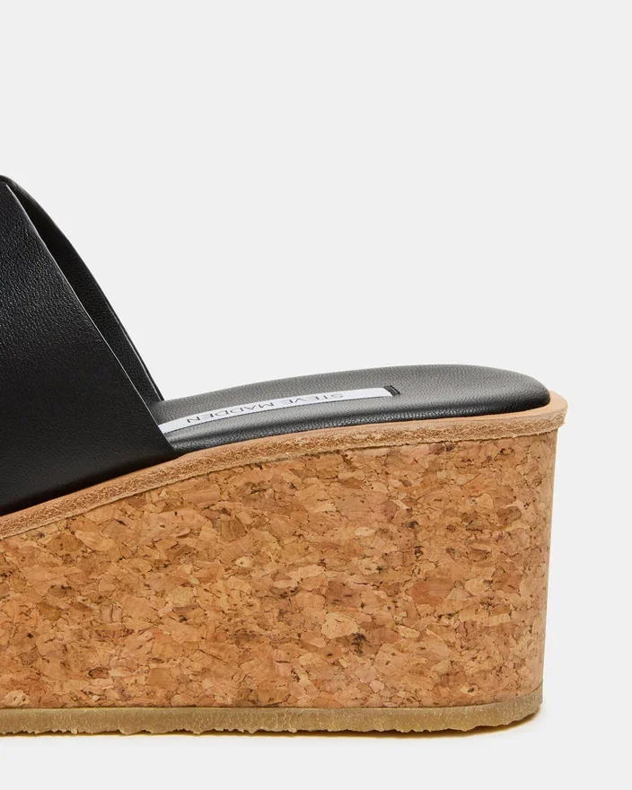 Harmony svart skinn-kilehæl-sandalen har en korkplatåsko som gir både stil og komfort hele dagen. Den strukturerte kilehælen gir stabil støtte uten å gå på bekostning av elegansen. Et allsidig valg for overgangen fra fritidsutflukter til festlige anledninger.