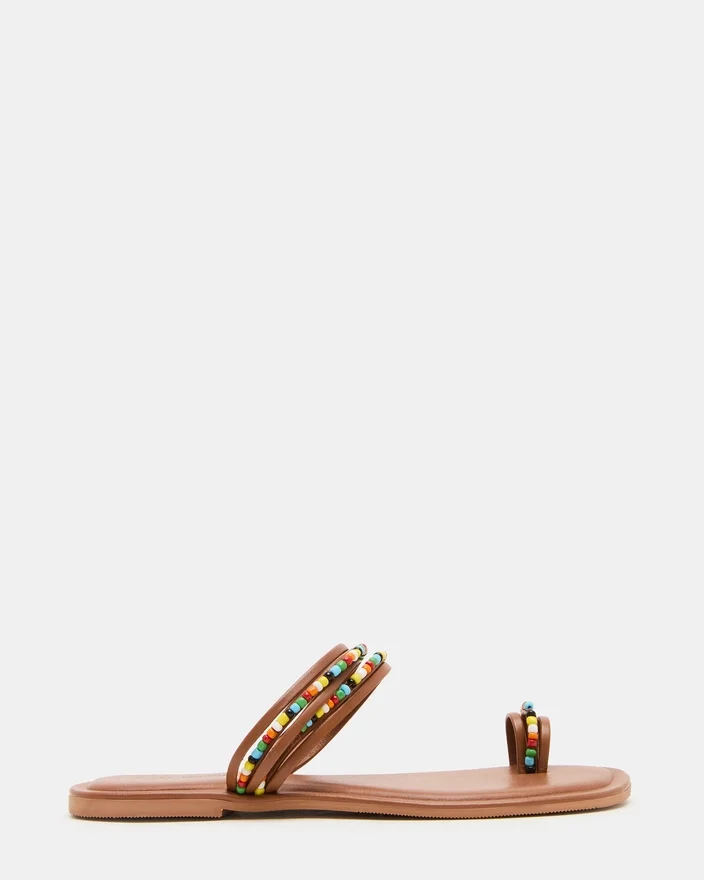 Nabila Tan Multi-sandaler har et karakteristisk design med firkantet tå, supplert med en rekke flerfargede perler, som gir et raffinert og kunstnerisk preg til din sommerfottøykolleksjon. De nøye utformede detaljene forbedrer både stil og komfort, noe som gjør den til et ideelt valg for de som setter pris på dyktig håndverk kombinert med livlig stil.