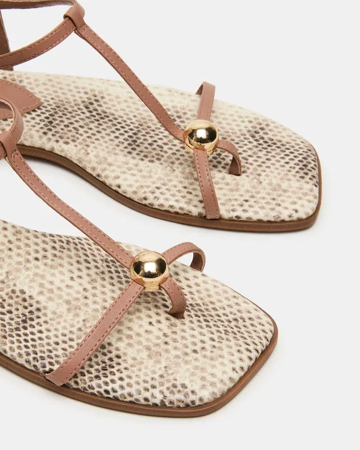 Løft looken din med Ritzy Natural Snake sandal med firkantet tå og stropper, fagmessig designet for både stil og komfort. Den moderne firkantede tåen gir et sofistikert preg, mens de delikate stroppene sikrer en god passform. Denne sandalen er perfekt for å pynte opp eller gi et ekstra preg til antrekk fra fritiden, og kombinerer moderne design med allsidig brukbarhet.