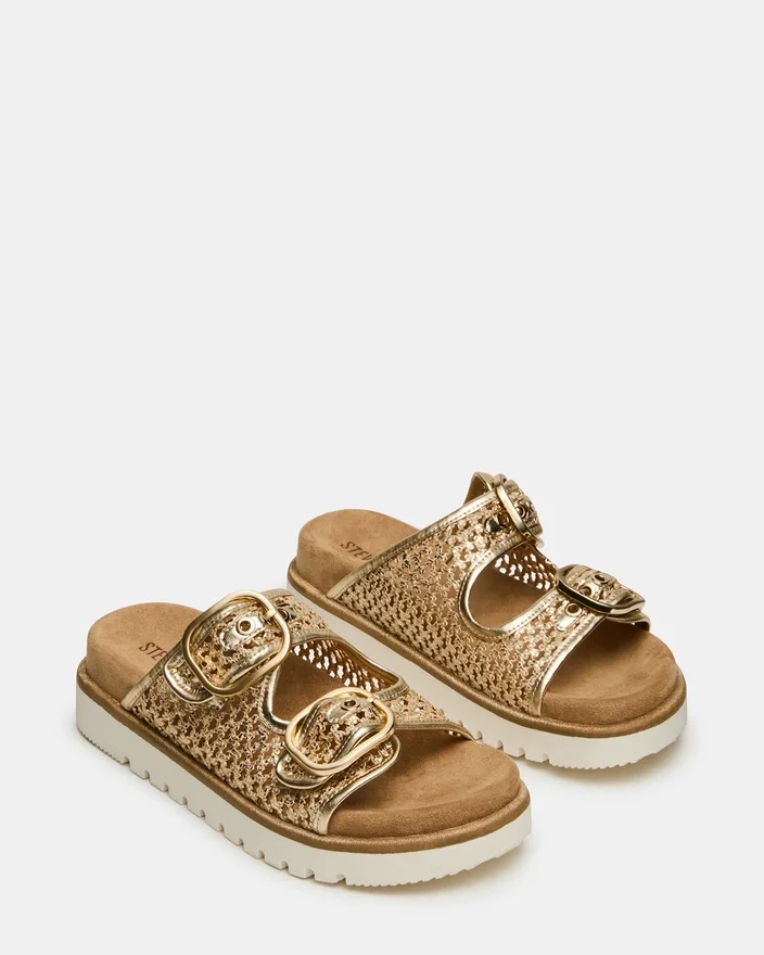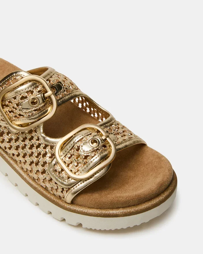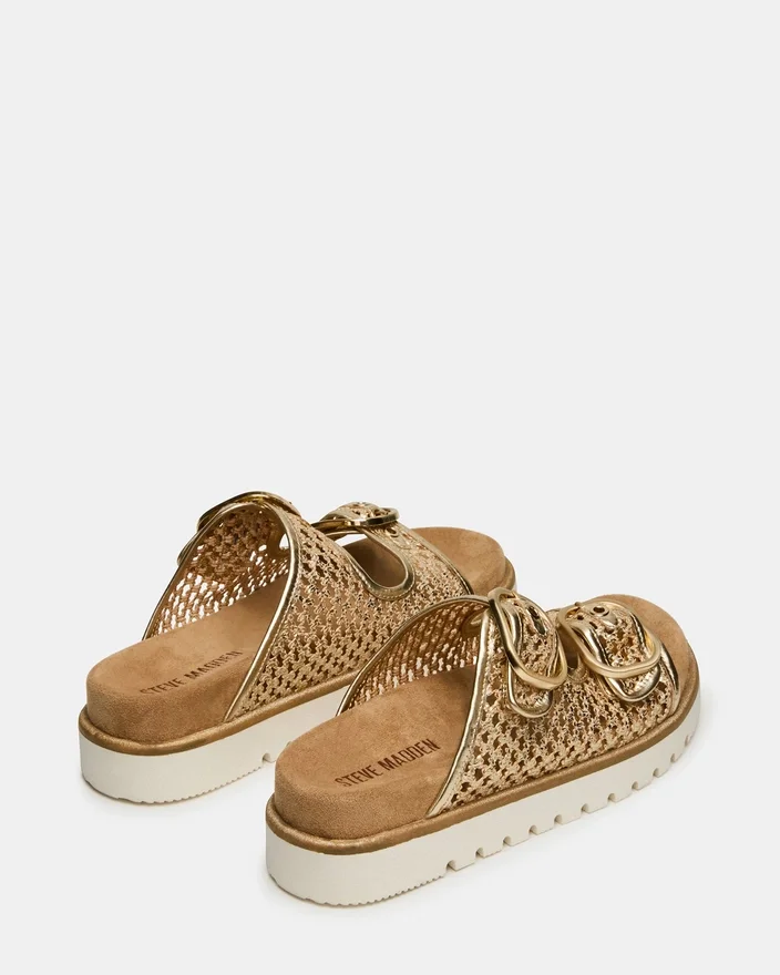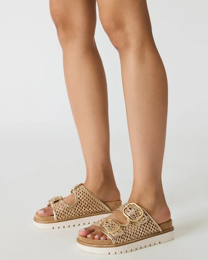 Shellby Gold er en fagmessig utformet vevd sandal designet for uanstrengt komfort og stil. Slide-silhuetten har sikre spennefester som gir justerbar passform og stabilitet gjennom hele dagen. En formet fotbed gir støtte til fotbuen og demping, noe som gjør dette allsidige produktet ideelt for både utflukter i fritiden og avslappede anledninger. Den vevde konstruksjonen gir et pustende fottøy som er perfekt for varmt vær.
