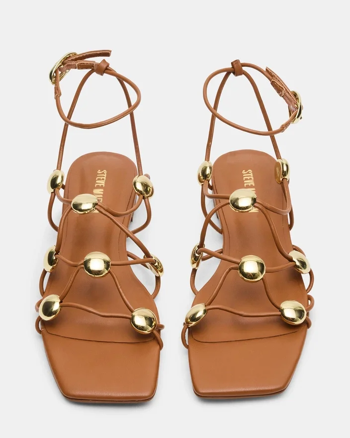 Tides Cognac har et sofistikert design med firkantet tå kombinert med delikate remdetaljer, og tilbyr et moderne, men tidløst sandalalternativ. Laget for både stil og komfort, forsterker de rene linjene og den varme cognacfargen allsidigheten, noe som gjør den ideell for å løfte ethvert antrekk med en elegant, profesjonell finish.