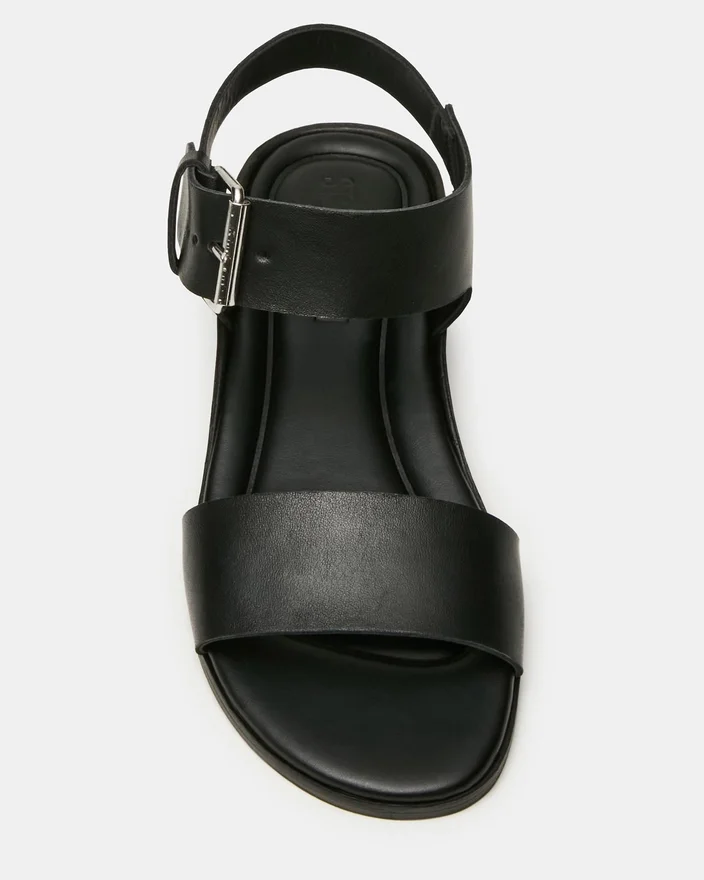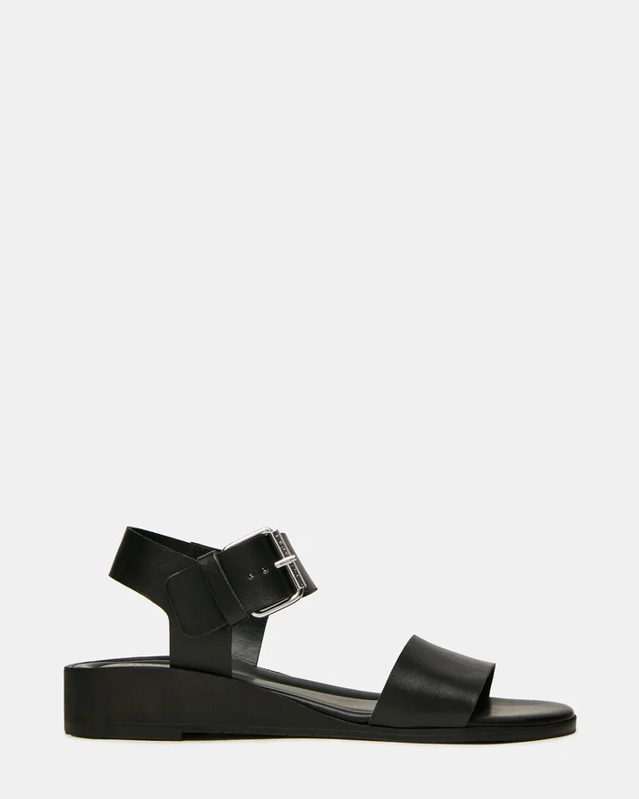 Vaeda svart skinn-kilehæl-sandalen kombinerer stil med hverdagsbruk. En justerbar spenne-rem sikrer en tilpasset passform, mens kilehælen gir pålitelig støtte og en diskret løft. Enten du skal på brunsj eller ut og gjøre ærender, tilpasser denne sandalen seg til livsstilen din med diskret raffinement og komfort hele dagen.